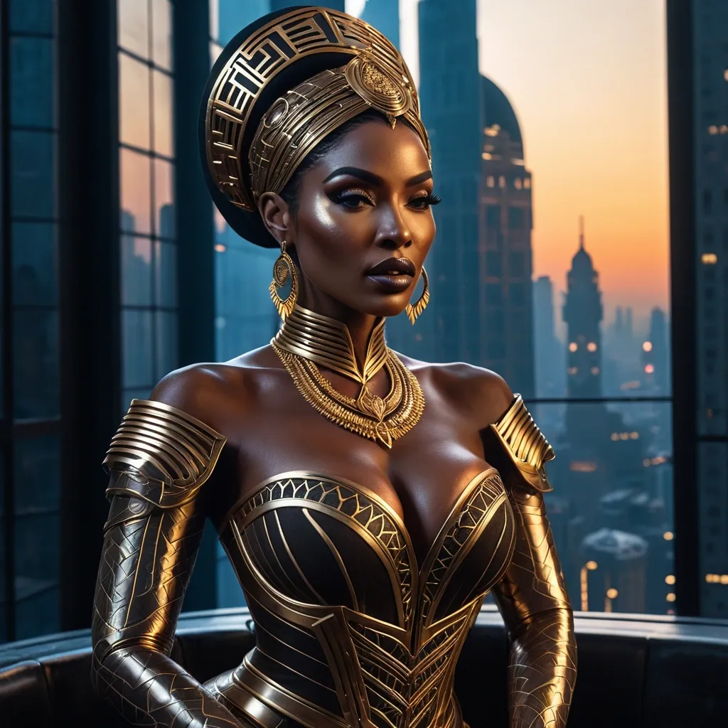 Generate a beautiful African-American woman with jaw-dropping beauty , full lips , face is a study in cinematic intensity. Her skin , rich and dark , glows softly under the interplay of warm golden light and cool neon spilling from the Dream City skyline. High cheekbones cast subtle shadows across her face , while her full lips , poised but unsmiling , suggest a woman who holds her thoughts close and releases them with precision only when needed. Her eyes — wide , deep , dark brown , and unblinking — convey both elegance and a watchful sharpness , the kind of gaze that makes allies feel safe and enemies hesitate. Framing this visage is her towering headwrap , woven from tech-infused copper-gold fabric that glimmers faintly , making her look like both queen and sentinel.Her outfit fuses heritage and futurism in a way only Dream City allows. The off-shoulder bodice , cream-toned and contoured , fits close against her chest , the material reinforced with subtle armored paneling that glints beneath the fabric whenever she shifts. From her waist flows a high-slit skirt of patterned black and bronze , its seams glowing faintly like veins of molten metal. The design pays homage to ancestral African patterns while embedding advanced technology into every stitch. Across her wrists , golden bangles gleam , their engravings concealing the hidden mechanics of Vale-forged microblades. Her hoop earrings , sleek and metallic , hum with encrypted frequencies — adornments that are as functional as they are beautiful.Her body is striking in its balance of power and grace. Broad-shouldered yet feminine , her physique carries the unmistakable presence of someone who has trained , fought , and survived. Her chest is full , her waist narrow , her hips and thighs sculpted with strength — a body built for movement and endurance. Every curve is emphasized by her tailored clothing , not as vanity but as deliberate design , broadcasting confidence and command. She embodies the duality of elegance and lethality: statuesque enough to silence a room , agile enough to dismantle it if required.Around her neck rests a necklace of delicate yet unmistakable significance — a gold chain bearing a small heart emblem. Unlike her other accessories , which serve hidden functions , this piece speaks only of faith and humanity. The heart glimmers softly , catching the noir light with a quiet resonance. It is her anchor , a reminder of love , devotion , and her Christian foundation in a city that thrives on betrayal. While her headwrap and bangles proclaim her readiness for battle , the heart pendant is her whisper of grace , the one vulnerability she keeps in plain sight.The setting frames her as if she were painted into Dream City itself. She sits in a leather chair within the retro-futuristic Vale lounge , its dark woods and metallic trims catching the low glow of lanterns and holographic fixtures. A porcelain-metallic teacup rests in her hand , faintly illuminated by gold tracings in its design , steam rising in delicate curls that mingle with the shadows. Behind her , tall windows reveal the Dream City skyline: spires of glass and steel , their neon veins pulsing blue against the night. The room , the city , and the light all bend toward her presence , making her not merely a figure within Dream City — but one of its pillars , brutal and beautiful , forged to endure. Modest top attire ,