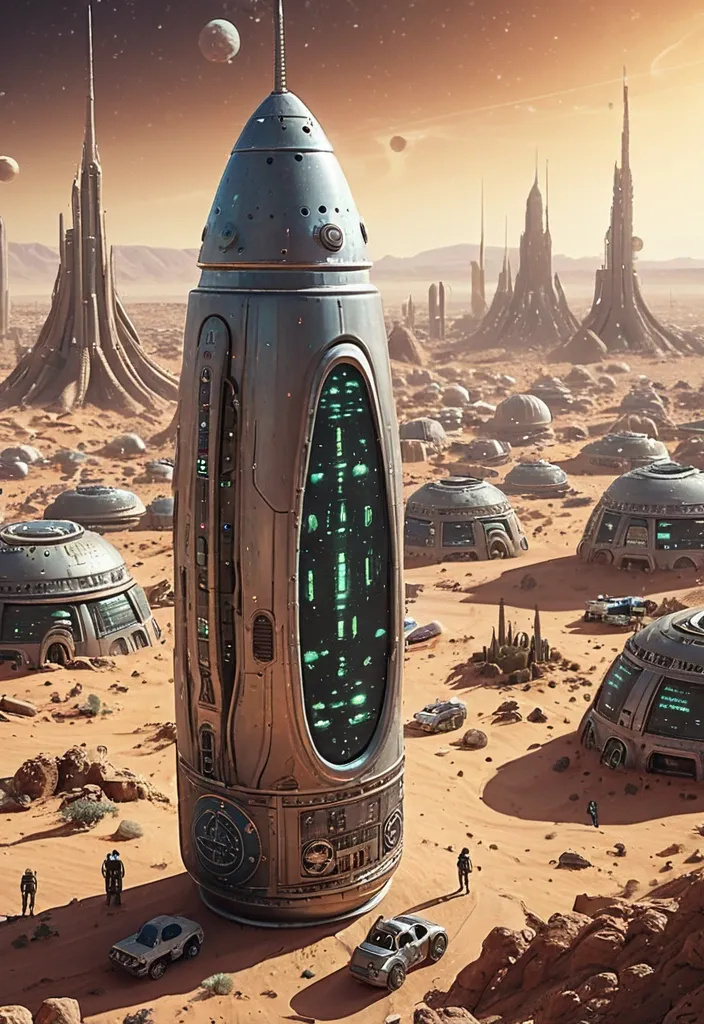 A Giant Alien City on a desert alien planet. The city is created out of a giant beer tin that is extremely elongated and has long teardrop shaped eye sockets. Part of the beer tin is removed where communications dishes and antenna protrude. The rest of the city rests inside the giant maw of the tin , with advanced , futuristic flying vehicles going in and out of the huge city beer tin and giant space ships hovering above the city. There are moons and space in the background. ,