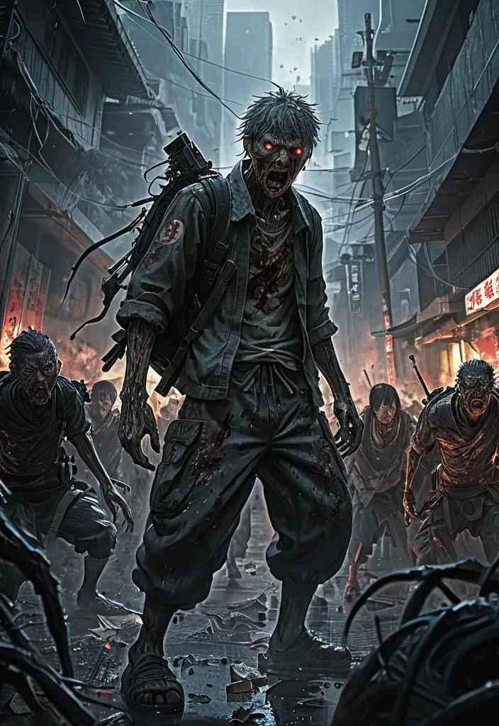 Award-winning , 4K digital painting in the style of Yoshitaka Amano. Detailed and intricate depiction of a zombie apocalypse , masterfully capturing the chaos and drama of the scene. Beautiful lighting and cinematic composition make this piece a true masterpiece , trending on artstation , Water Color ,