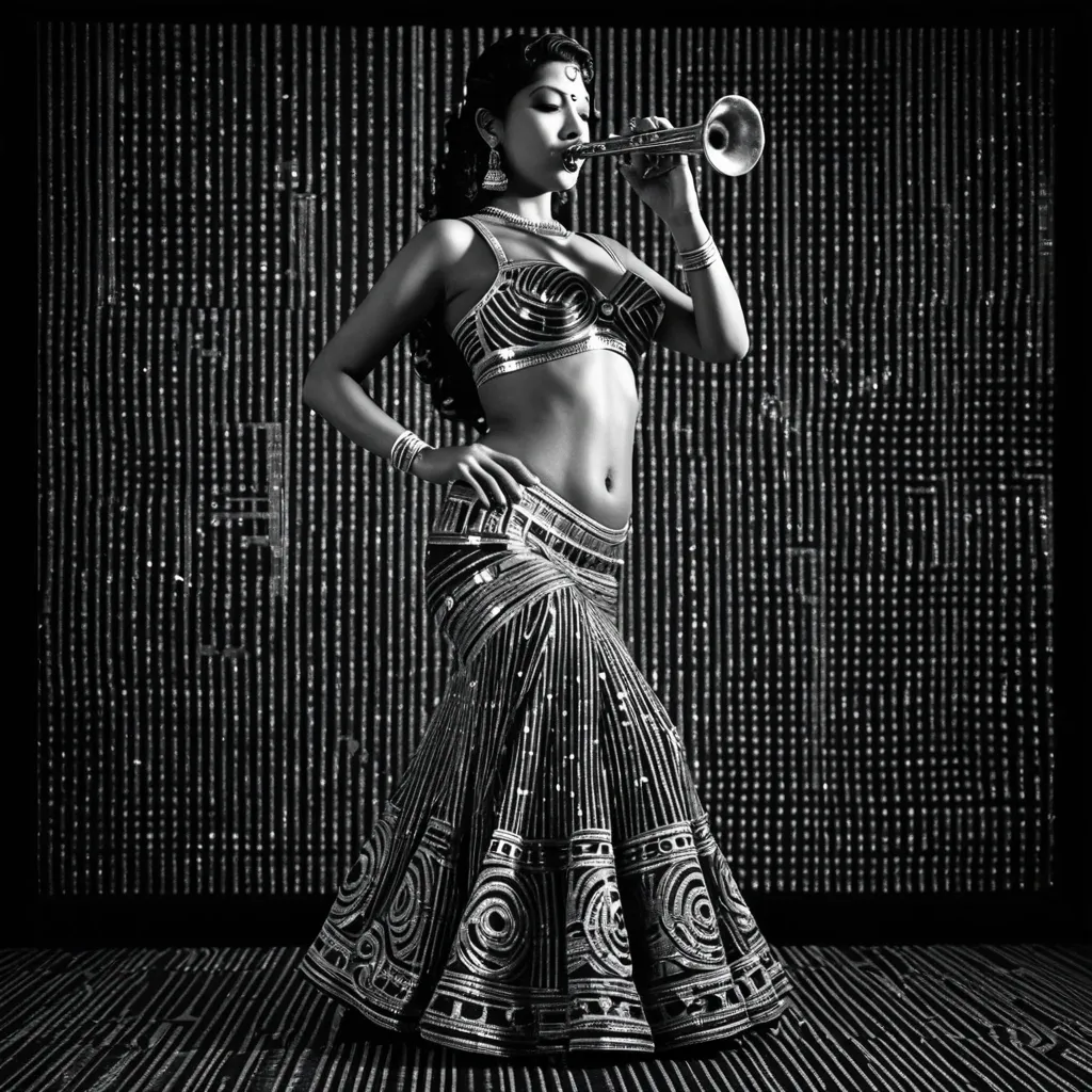 A Aztec style , horizontal scan lines and digital interference , vertical full body of a sensual pin-up jazz singer , playing Trumpet , wearing Sequin Embroidery Semi-Stitched Lehenga Choli , embodying the irresistible allure of classic film noir and vintage Hollywood glamour , fantasy , horizontally distorted figure with scan line interference pattern , soft diffused lighting , corrupted data aesthetic with noise texture and horizontal artifacts ,