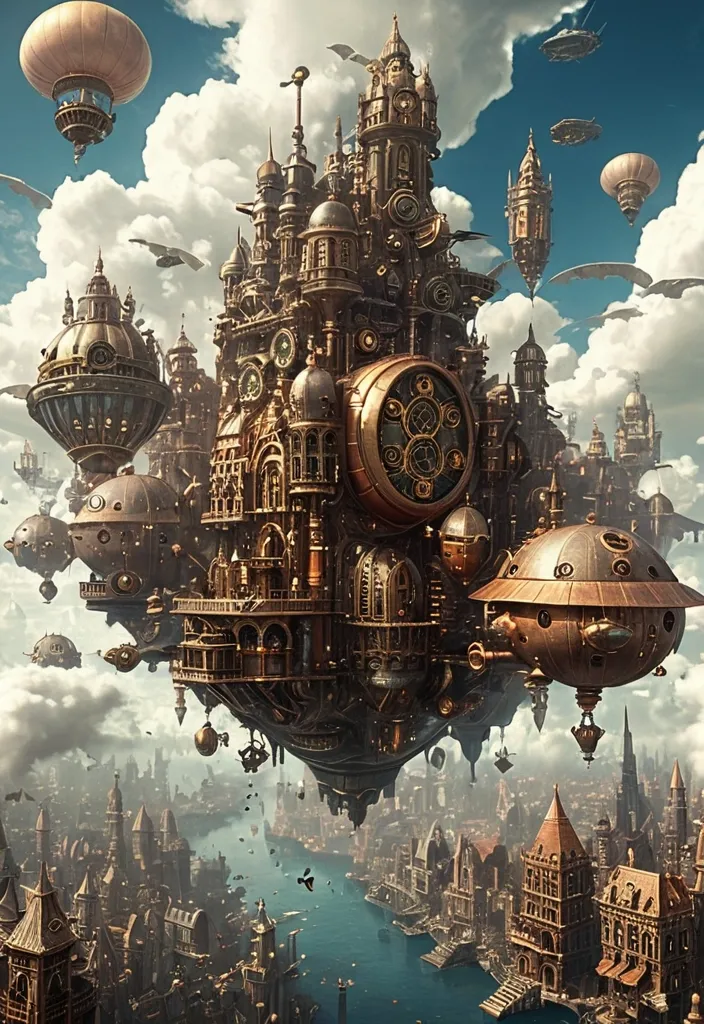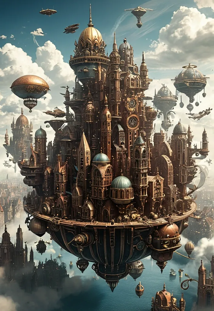 A divine steampunk city floating in the clouds with a multitude of flying islands around it and airships too. ,