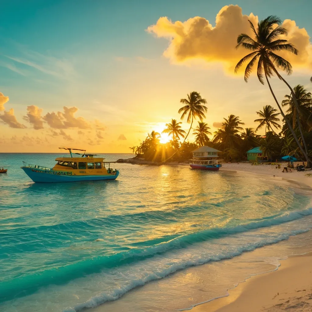 Sunset over the turquoise waters of San Andrés Island , Colombia — golden sky reflecting on the calm Caribbean Sea , smiling travelers enjoying the beach walk at Spratt Bight , palm trees swaying gently in the breeze , colorful boats anchored near the shore , tropical glow , warm vibrant tones , cinematic lighting , ultra realistic photography , travel advertisement style , inviting and relaxing atmosphere , perfect Caribbean escape , discover paradise in Colombia --style raw --ar 16:9 --v 5 --q 2 ,