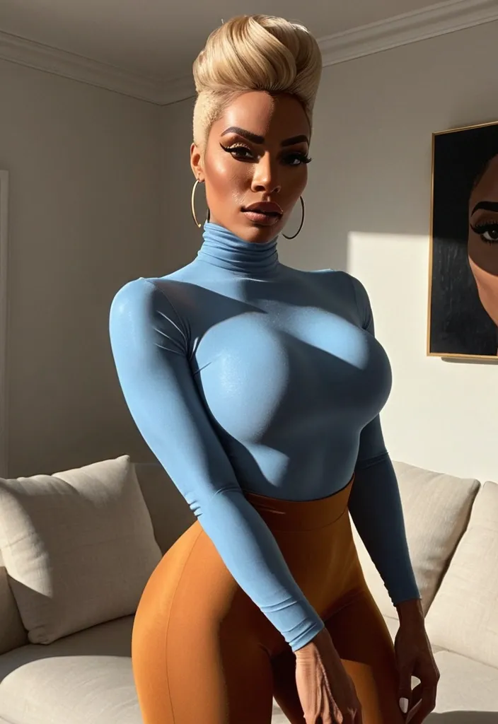 Light-skinned African-American woman — extremely beautiful , with a presence that feels quietly dangerous and quietly royal at the same time. She has that soft glow in her skin that looks effortless , like she wakes up looking like this every day without trying , but everyone knows she still probably puts in discipline the old fashioned way. Her bone structure is model tier… cheekbones that could cut through pride , a jawline that says she doesn’t bend for just anybody , and soft lips that hold mystery and restraint all at once.Her short hair is cropped close , styled in textured waves that shape her face like an artist’s finishing brush stroke. It gives her a striking , modern elegance — feminine , but with that slight edge that tells you she’s not the type anyone ever controls. Her eyebrows are naturally bold and shaped sharply , framing her icy blue eyes that practically glow with their own weather system. Those eyes… you could lose a fight in those eyes before she ever speaks a word.She has luminous , glossy skin that reflects light like polished bronze catching early morning sun. Natural freckles sprinkle just lightly across her cheeks , softening the intimidation factor with a hint of youthful innocence. The way the light hits her face makes her look sculpted — like an ultra realistic painting brought to life. Everything about her looks intentional… but also like she was born this way.There’s also this quiet calm in her expression — not emotional weakness — but a poised , unshakeable stillness that only comes from knowing exactly who you are and not needing to defend it. She looks like the woman who never rushes into noise… she waits , she observes , she lets the room shift around her while she remains unmoved. That alone is power — and she wears it naturally like an old soul who understands her worth in ways other people are still scrambling to figure out , blonde short pompadour hair , beige and orange velvet bodysuit , gold necklace , muscular body builder woman , abnormally massive woman , enormous breast , enormous butt , turtleneck , blue closed collar , crew neck top. in beautiful living room , gold pants ,