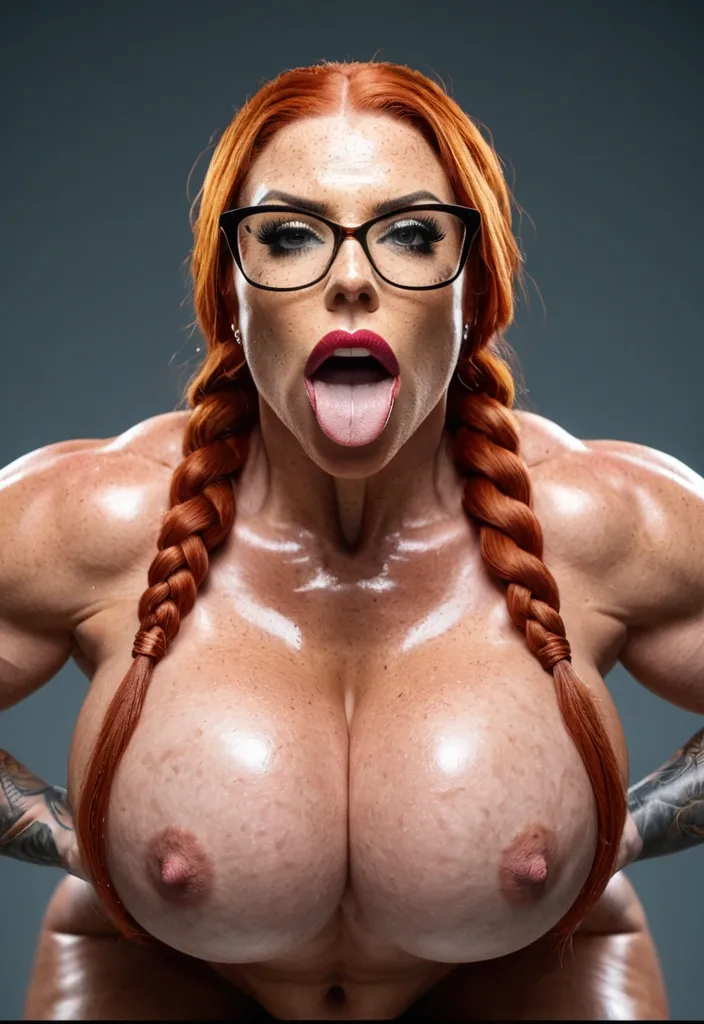Generate Gorgeous female boss , bimbo , eye glasses , hourglass body , abnormally massive female bodybuilder , gorgeous , close up , full lips , big booty , redheaded , freckles on face and breast , braided design hair , feminine silhouette , too big breast , big booty , sexy thighs abs , silhouette , up close , flexing biceps , beautiful green eyes , legs are iconic and defining physical feature , both visually and in terms of combat ability.wearing an outfit that is a striking blend of elegance , power , and femininity , designed to command attention in any room. The suit is tailored to perfection , hugging the wearer’s curves with precision while emphasizing a structured silhouette. The fabric itself is a refined grey tweed patterned with subtle white grid lines , giving the suit a texture that feels both sophisticated and modern. The blazer features broad blue lapels and gold button accents , adding a luxurious touch that elevates the look beyond typical business attire. The matching high-waisted trousers elongate the frame , further enhancing the poised and commanding effect of the ensemble.The styling choices amplify the boldness of the suit. The inner blouse is a silky , greybutton-down shirt that complements the tweed’s tone while introducing a softer , feminine balance to the sharp tailoring of the jacket. The blouse peeks out neatly from under the blazer , maintaining elegance without drawing focus away from the suit’s commanding cut. Accessories are kept minimal yet intentional: a delicate layered gold necklace and hoop earrings that add glimmers of light and luxury without overpowering the outfit. The choice of voluminous , honey-brown braids cascading down her shoulders frames the face with both confidence and glamour , completing the commanding visual.Altogether , this look communicates a blend of authority and allure. It is business-ready yet fashion-forward , balancing corporate structure with vibrant femininity. The color palette blue , grey and gold avoids being overly delicate , instead embracing the richness of texture , structure , and presence. This is the kind of ensemble that speaks to ambition , sophistication , and personal style—ideal for someone who thrives in positions of influence but insists on expressing her individuality with bold elegance. It’s not just clothing—it’s a statement of power wrapped in grace. In luxury living legs that could crush a watermelon , skirt high boots are a bold and striking statement piece , crafted in glossy black patent leather that gives them a sleek , polished finish. Rising to just below the knee , the boots feature three adjustable buckle straps along the shaft , adding both edge and detail to their design. The towering stiletto heel , paired with a thick platform sole , creates an ultra-dramatic silhouette that elongates the leg and exudes power and confidence. With their combination of shine , height , and structure , these boots perfectly balance fierce femininity with high-fashion allure. , enormous butt , enormous breast , She is leaning forward with her elbows likely resting on a surface , causing her upper body to tilt toward the viewer. Her scowl expression on her face. The low-cut top emphasizes her posture , drawing attention to her chest as she gazes directly ahead. Squeezing her breast together , scowl on face , enormous butt , up closeIntense eyes , scowl on face , The low-cut top emphasizes her posture , drawing attention to her chest as she gazes directly ahead. Enormous butt , massive cleavage , long thick tongue , drooling from tongue lots of drool , drool on breast , long tongue , lots on drool dripping on breast , breast is wet , drool dripping from breast ,