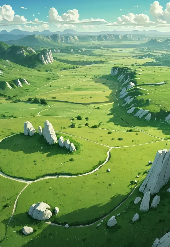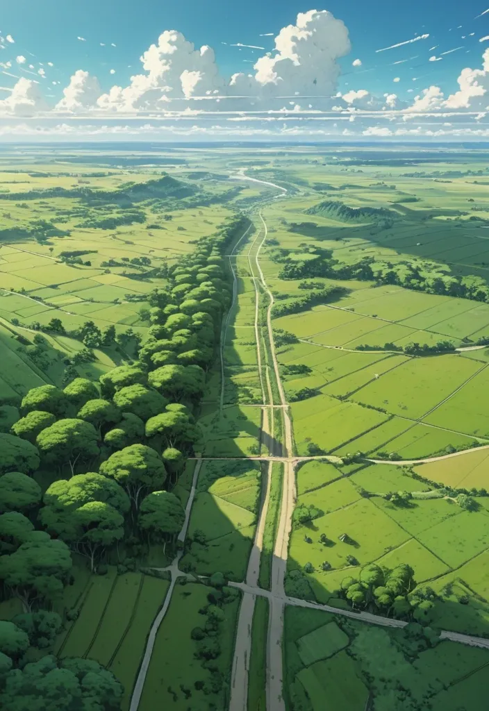 Aerial view , top-down view of a symbolic depiction of 'A Fresh Start' , a beautiful woman wearing a dress created from blooming cherry flowers and a fluorescent green train standing on a pathway made of scattered , smooth white stones leading through a field of gently swaying lavender towards a soft , luminous horizon. Butterflies with iridescent wings flutter around , representing transformation. The image is rendered with a gentle , painterly quality , focusing on light and atmosphere. ,
