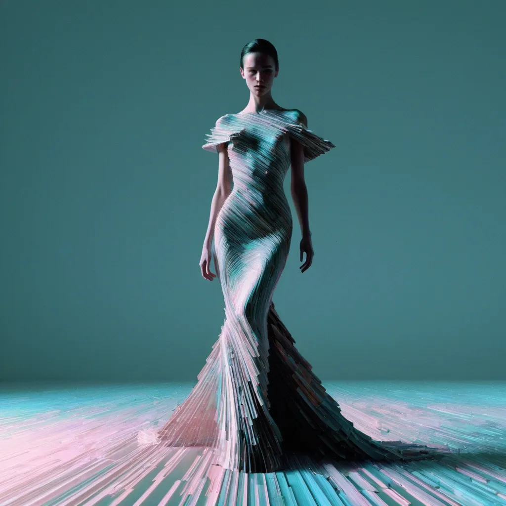 Professional photograph , full-length shot of glitch art , minimalistic of elegant woman striding forward in a dramatic , heavily textured haute couture gown , with a delicate presence silhouette , clearly defined edges , clean minimal aesthetic , vertical digital distortion and fragmented interference patterns overlaying figure , pixelation , randomized vertical glitch artifacts , data corruption aesthetic , softly diffused ambient lighting , pastel hues accentuating glitches , high-definition digital noise texture. ,