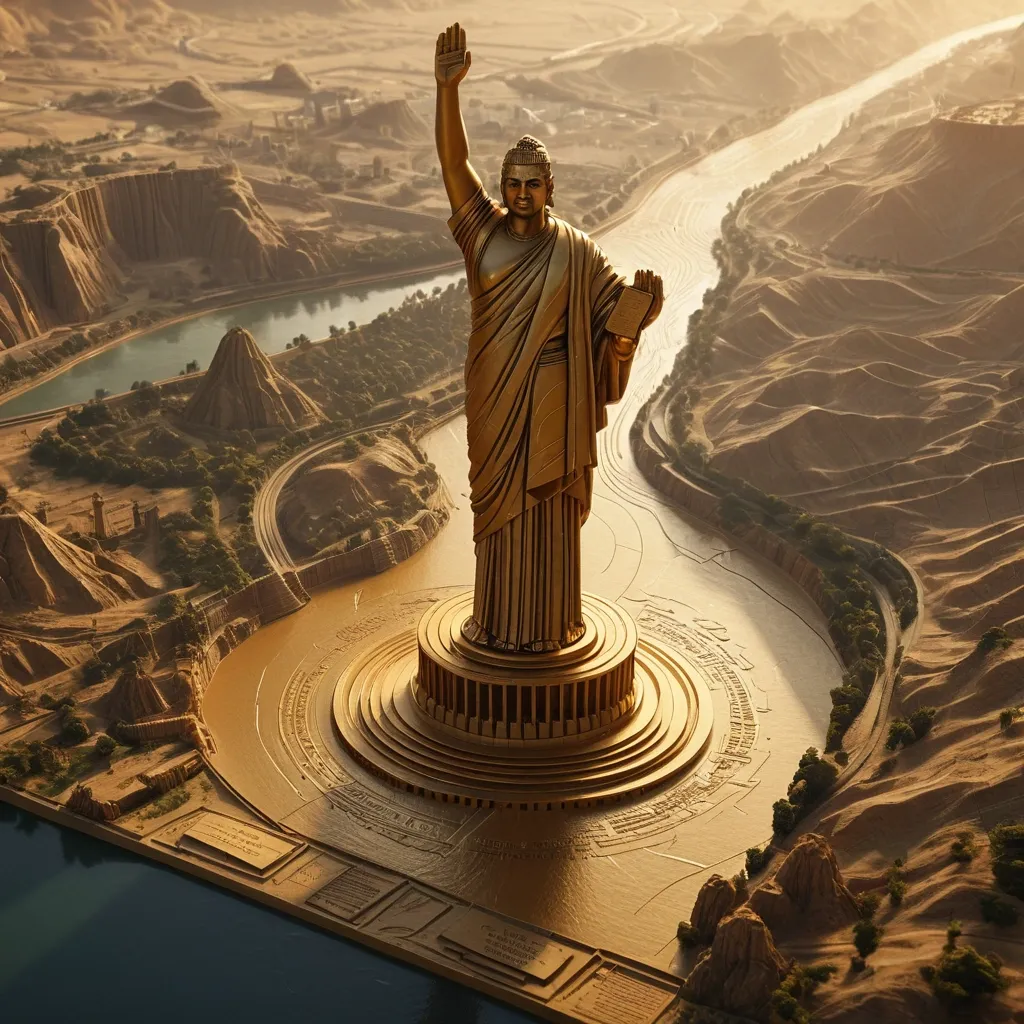 Epic 3D isometric atlas scene: a massive ancient map of Statue of Unity is the world's tallest statue , located at bank of Narmada river as focal point erupts from an unfurled parchment scroll , filling nearly the entire frame. Ink lines ignite into living terrain: A highly detailed miniature landscape representing area near Kevadia , Gujarat , with iconic natural mountains ranges push upward , cities rise in vertical layers , dam on river glow and flow , borders burn softly in gold. It should have icon of tall statue icon somewhere in map , with Soft ambient lighting. A carved timeline spirals across the map with engraved dates. All text in English. Extreme scale contrast , dense micro-detail everywhere , dramatic golden-hour light , volumetric dust , cinematic depth , 8K , UE5. ,