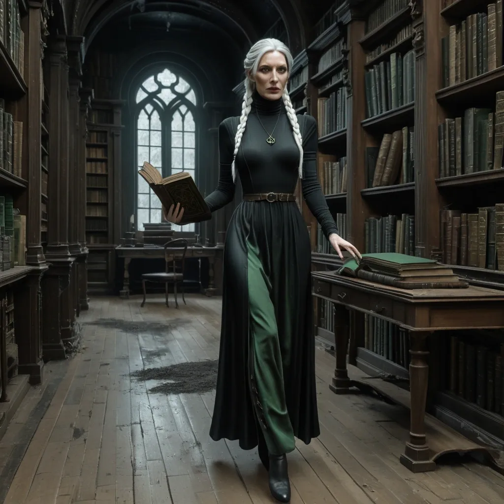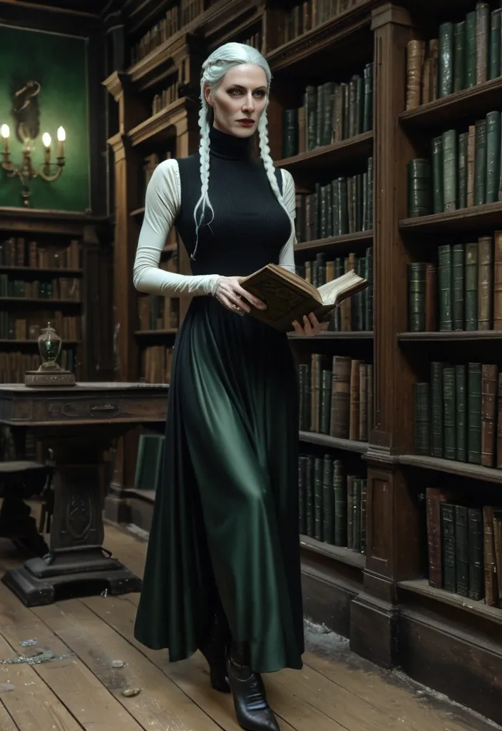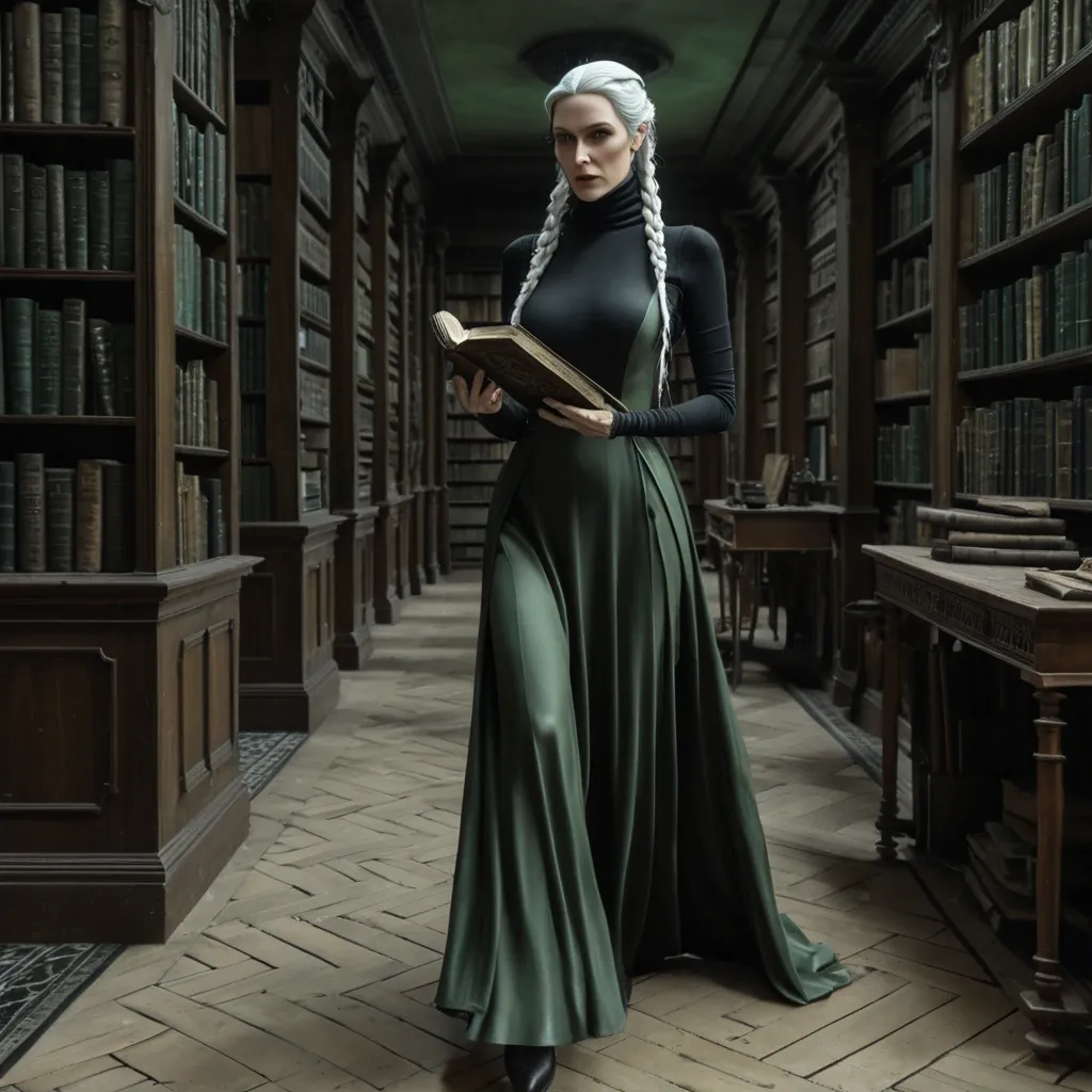 Masterpiece , photorealistic full-length , natural face , beautiful face , depiction of a young woman in her thirties with a long white braid , pale ivory skin dressed in long black silky turtleneck sleeveless dress , barefoot , walking in gloomy , very dusty library filled with old furniture. She's handing an old esoteric grimoire in a hand and a shinny green artifact in the other. Mysterious atmosphere. ,