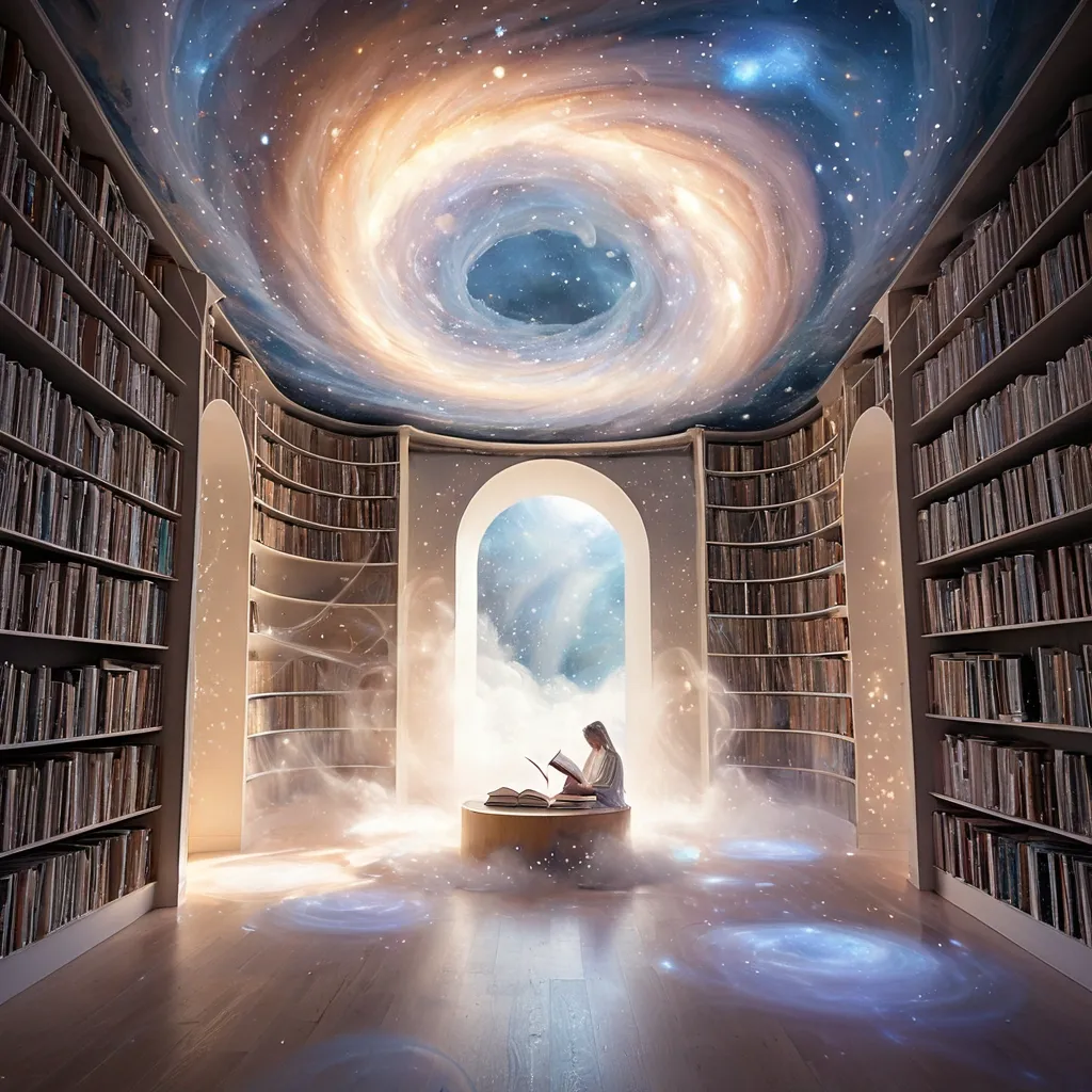 An ethereal , abstract reading space where the 'books' are shimmering portals to other dimensions , and the 'seating' is a cloud-like formation of pure light. The environment is bathed in a soft , celestial glow , with wisps of cosmic energy swirling around. The overall feeling is one of quiet contemplation and infinite possibility , inspired by abstract expressionism and celestial art. The style is ethereal , abstract , and celestial. ,