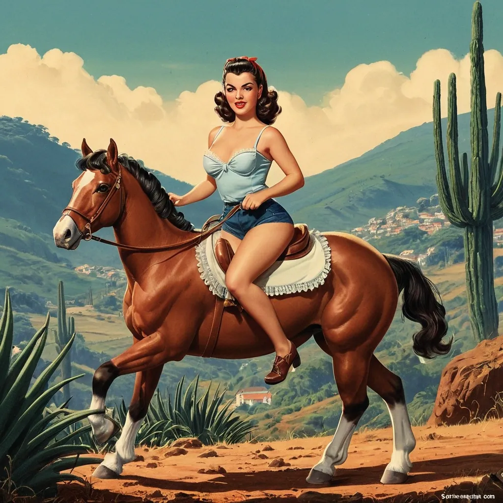 **Prompt:**Crie uma ilustração no estilo vintage pin-up dos anos 50 , retratando uma mulher deslumbrante e sexy montando um cavalo em um cenário de faroeste. A pin-up deve ter cabelos volumosos e soltos ao vento , usando um short curtinho jeans que se destaca contra a natureza ao seu redor. O cavalo , um belo exemplar de pelagem castanha , deve estar em movimento , com a crina balançando ao vento.Ao fundo , um vasto campo se estende até as montanhas majestosas , sob um céu azul claro salpicado de nuvens brancas. Elementos típicos do faroeste , como cactos e uma cerca de madeira desgastada , podem ser vistos ao longe , adicionando um toque autêntico à cena. A luz do sol ilumina a cena , criando sombras suaves e destacando os detalhes do vestido e da pelagem do cavalo. O clima deve transmitir uma sensação de liberdade e aventura , evocando o espírito do Velho Oeste. ,