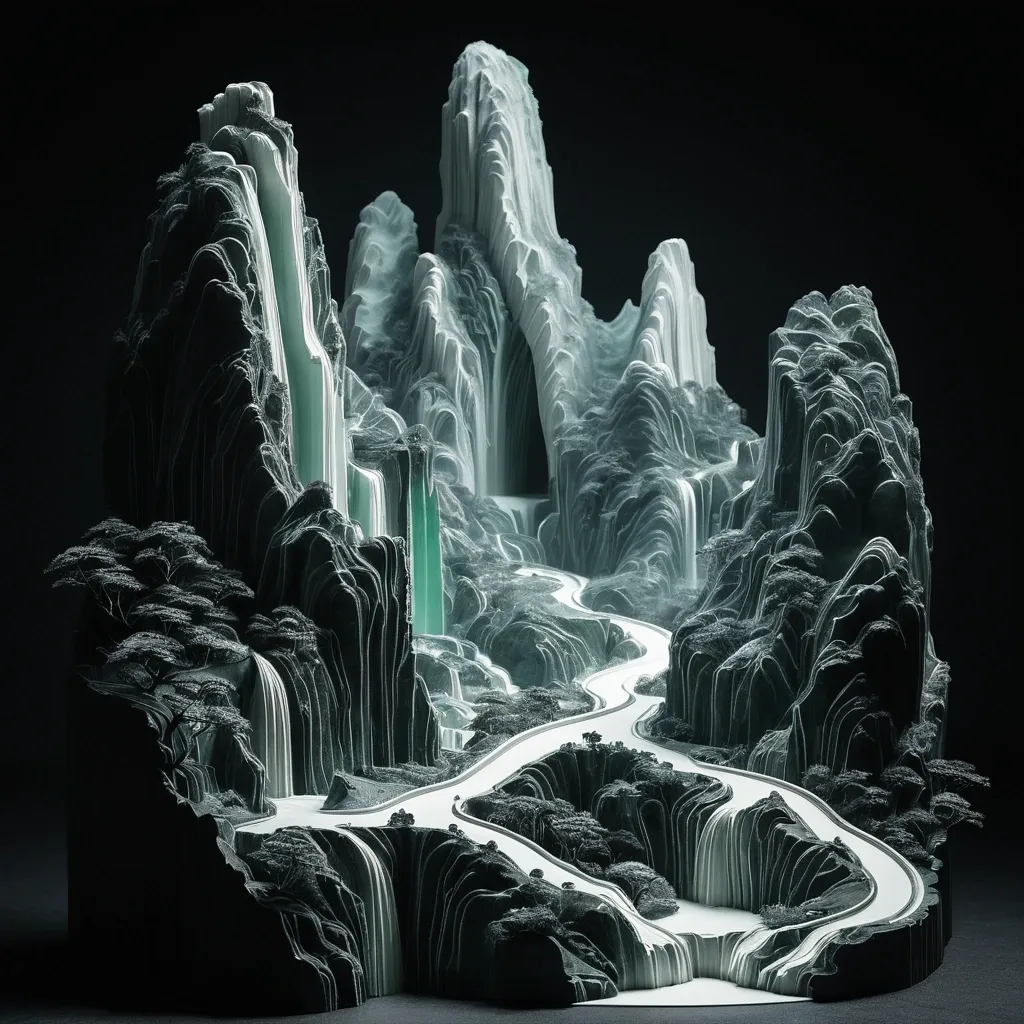 A vertical composition 3D topographic layered sculpture of a Guizhou Province landscape. The style is Chinese minimalism. Countless flowing , organic layers of semi-translucent jade-like porcelain and textured paper stack. Deep ambient occlusion creates soft , profound shadows between the layers , giving incredible depth and tactile quality. The beautiful highway in Guizhou Province , surrounded with Seven steps waterfalls , with its strange-shaped pillars , hidden valleys , shimmering mist of cloud , and limestone caves. The edges of the landscape fade softly into a pure black background with ample negative space (liu bai) at the top. Studio lighting , ultra-detailed , intricate textures. ,