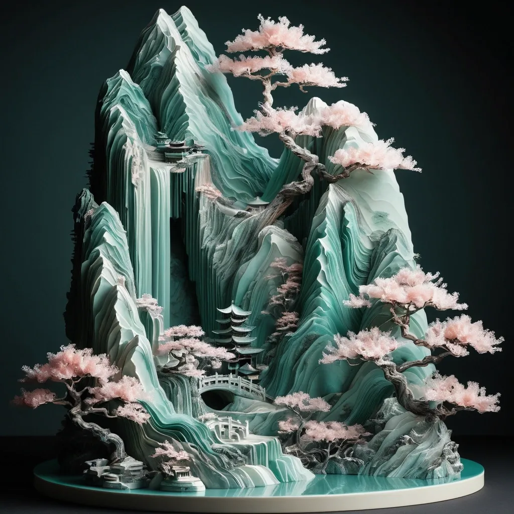 A vertical composition 3D topographic layered sculpture of a grand Chinese landscape. The style is Neo-Chinese minimalism. Countless flowing , organic layers of semi-translucent jade-like porcelain and textured paper stack to form rolling mountains and rivers , translucent bird fly through intricate coral formations. Deep ambient occlusion creates soft , profound shadows between the layers , giving incredible depth and tactile quality. The colors are inspired by traditional Chinese mineral painting: muted cyan , mineral green , ochre , and cream. realistic image of a magnificent and majestic pink cherry blossom tree in a mountain landscape , like a bonsai tree , with a large trunk. Show the entire tree. Depict it in an early winter setting. The edges of the landscape fade softly into a pure black background with ample negative space (liu bai) at the top. Studio lighting , ultra-detailed , intricate textures. ,