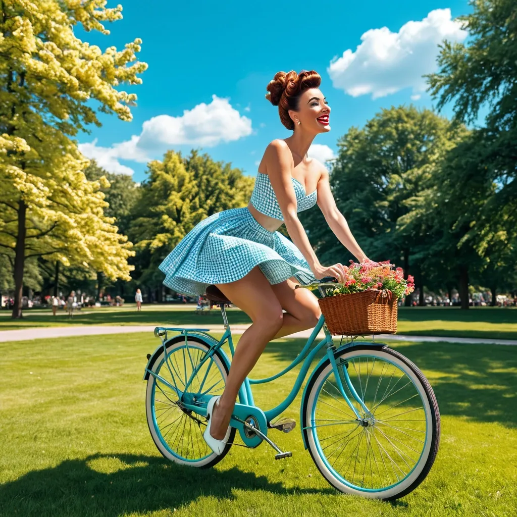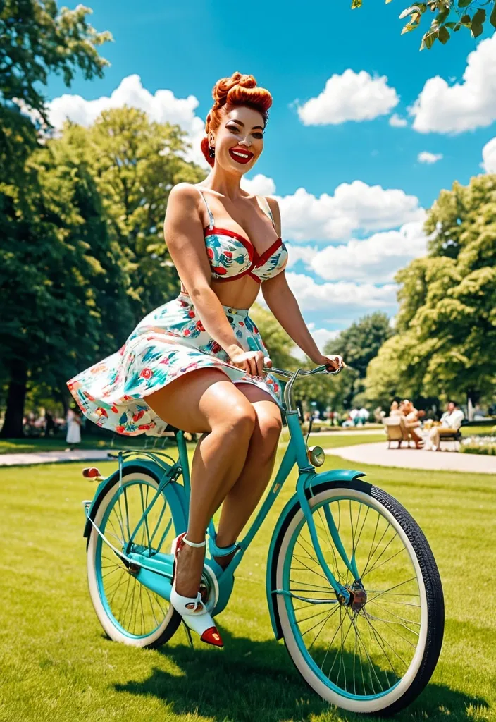 Imagine a vibrant and nostalgic scene in the style of a 1950s pin-up. In the center of the image , a beautiful and charming woman is riding a vintage bicycle , pedaling smoothly through a sunny park. She has a radiant smile , and her voluminous hair is styled in an unpretentious bun , with a few loose strands framing her face. The woman is dressed in a bikini and a short skirt that moves gracefully in the wind , revealing a bit of her bust and highlighting her curves. Her posture is confident , with her backside slightly arched , adding a touch of charm to her pose. Around her , young men watch in admiration , with expressions of enchantment on their faces. The park is lush , filled with leafy trees , colorful flowers , and a verdant lawn , all under a clear blue sky with a few fluffy white clouds. The scene captures the essence of freedom and the joyful spirit of the 1950s , with a vibrant color palette and a touch of nostalgia , featuring highly detailed 1950s pin-up art. ,
