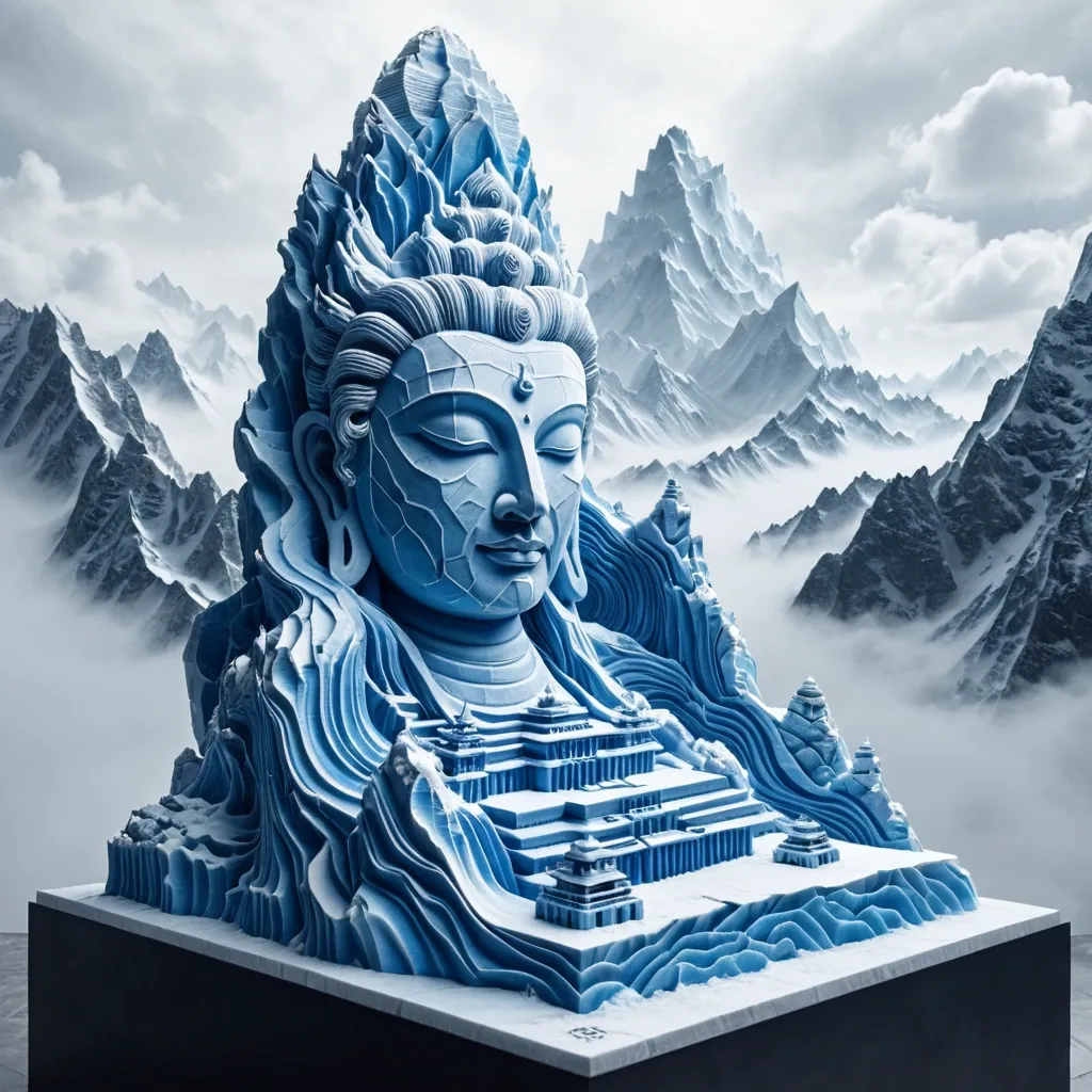 A horizontal , 3D topographic sculpture of a Himalayan mountains landscape , crafted in minimalist style , features layered , blue-like porcelain and textured ice-cubes. Organic , flowing layers stack to create profound shadows through deep ambient occlusion , yielding a tactile , deeply textured form. A floating island , suspended in a sea of clouds , worn monument of a giant frozen Cliff lord Shiva face sculpted to resemble. The monument's visage , depicting a guardian , dissolves into the clouds. Softly fading into a spiritual symbol "ॐ" , the landscape's edges create ample negative space , characteristic of liu bai. Ultra-detailed textures and studio lighting accentuate the intricate form. space background. ,