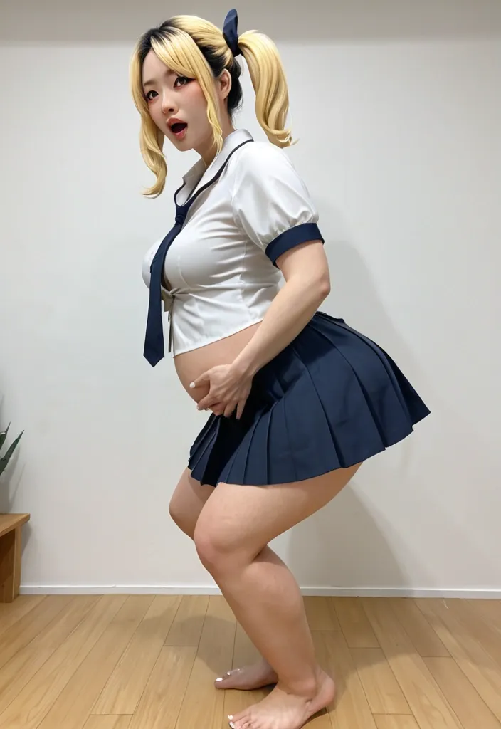 Anime-style image of a cute blonde girl with pigtails , visibly pregnant with a large round belly , standing barefoot. She is wearing a classic Japanese school uniform: white short-sleeve blouse unbuttoned at the top , navy blue pleated skirt lifted up with one hand , white panties pulled down to her thighs. She is in a high squat position while standing , legs spread wide , knees bent deeply , ass pushed out. One hand is lifting her pregnant belly from underneath to expose it. Flushed cheeks , submissive and embarrassed expression , mouth slightly open , looking at the viewer. Soft indoor lighting , clear front view focusing on the pregnant body , lifted skirt and squatting pose. Teasing but not extremely explicit. ,