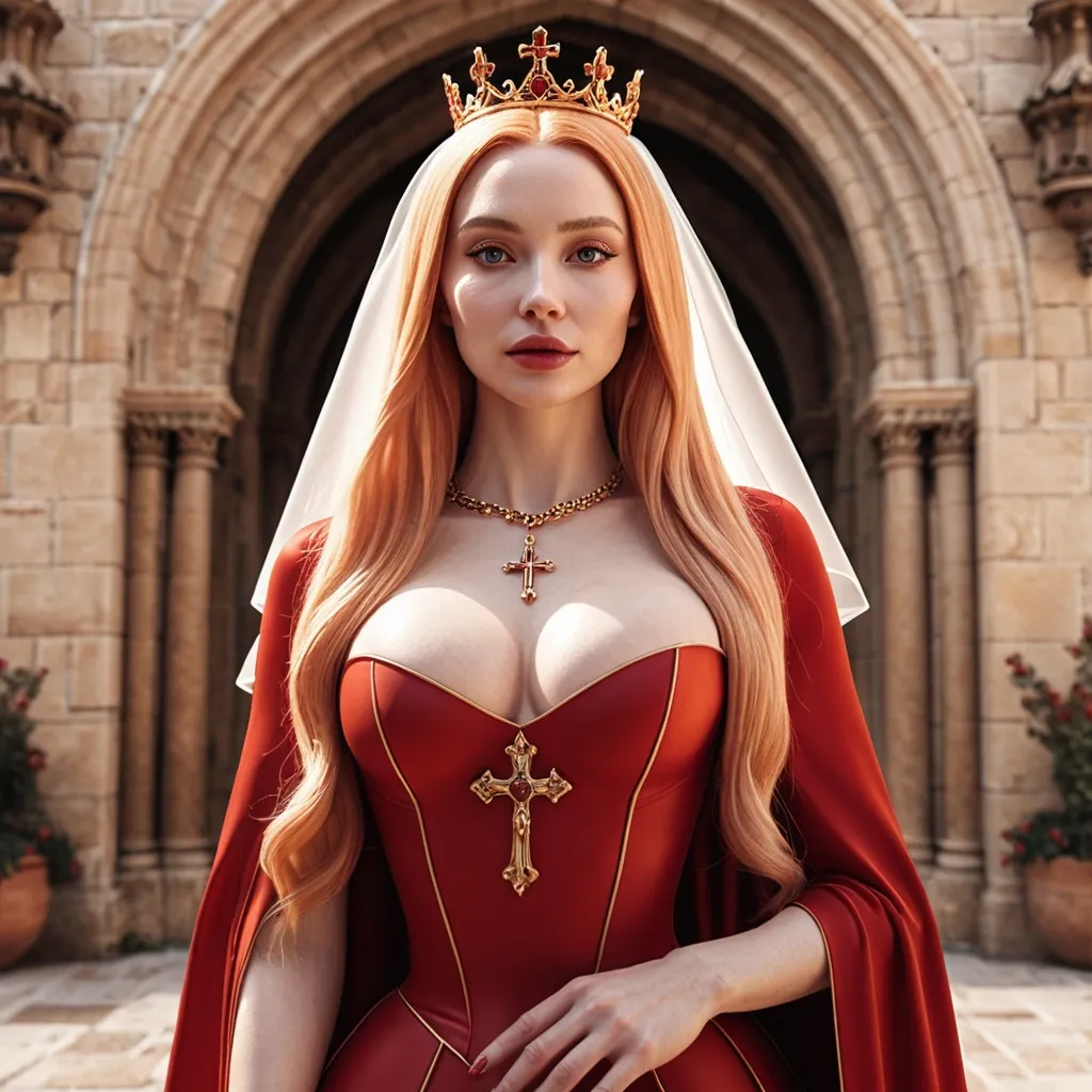 Full body portrait photograph of Dove Cameron as medieval spanish queen , strawberry blonde , young beautiful woman , perfect smooth face , rounded cheeks , (matte) (intricate) (red dress) , (covered arms) , (white veil) , golden crown , cross necklace , crucifx , spanish castle , ultra realistic , concept art , elegant , , depth of field , ((professionally color graded)) , 8k , 4k , clean , realistic face , realistic eyes , highest quality , realistic hands , trending on artstation , masterpiece , NSFW , five fingers , (big inflated bosom) , smooth skin with a pink orange tint , not too pale , head to knees view , visible thigh , three-quarter pose ,