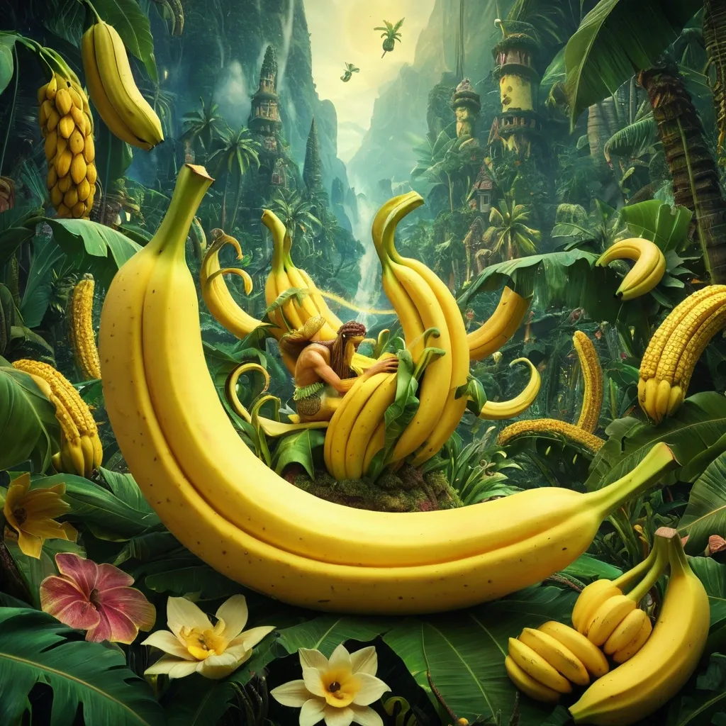 An aerial view of a city built entirely from discarded musical instruments , where brass horns form skyscrapers and drum skins serve as rooftops. Rivers of flowing sheet music wind through the urban landscape , and the sky is filled with floating treble clefs. The style is a vibrant , surrealist interpretation , akin to the works of Hieronymus Bosch meets Salvador Dalí , with a whimsical , fantastical atmosphere. ,