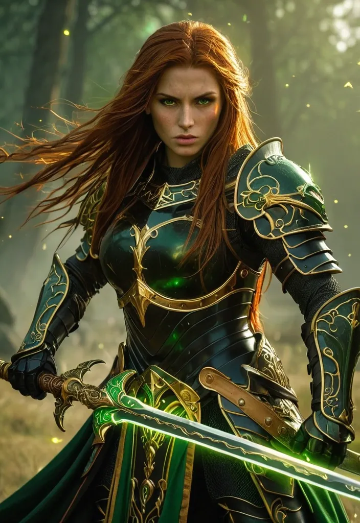 realistic face , a wavy shoulder auburn hair 25yo pale woman , wearing black and purple steampunk dress armour have a steampunk lmagic staff in her right hand and an opened magic book on her left hand , she's standing fierly with a shy smile on a steampunk city battlefield. some aliens monsters on the background and fires ,