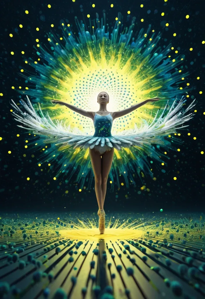 Creative feathers resembling a sun-like in vortex , (3D rendering:1.1) Horizontal surreal composed of (white , blue and green particles fading into the dark sky:1.1) , with a smaller flow , lighter (blue and green particle formation behind it diminishing in size:1.0) , a Ballet dancer rendered in a soothing steady display of pattern (dim-yellow dots reflecting on calm , reflective ground:1.2) , extending from the base of the structures into the foreground. (Surrealism:1.2) , digital art , (high detail:1.1) , (intricate textures:1.0) , photo-realistic , octane render , vivid colors , smooth reflections , award-winning art , concept art. auditorium background. ,