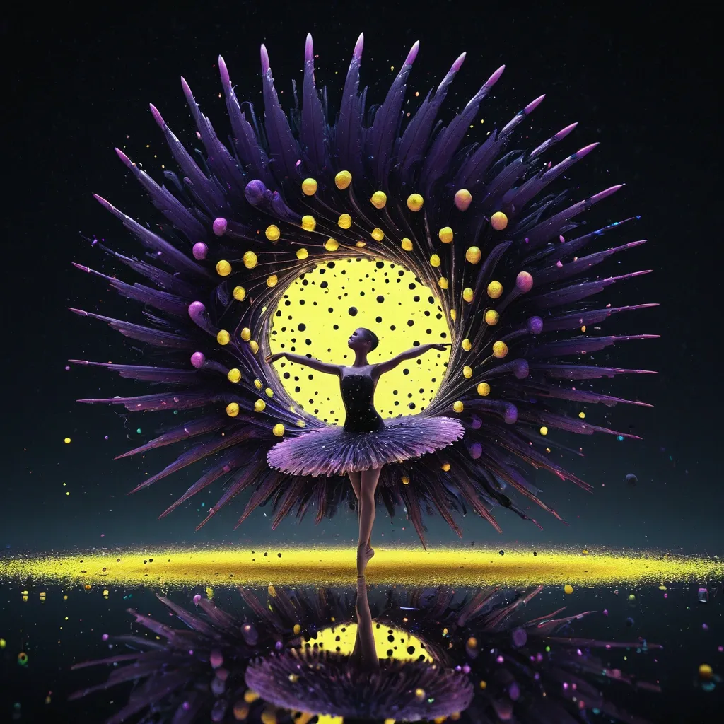 Creative feathers resembling a sun-like in vortex , (3D rendering:1.1) Horizontal surreal composed of (purple , black and pink particles fading into the dark sky:1.1) , with a smaller flow , lighter (blue and green particle formation behind it diminishing in size:1.0). a Ballet dancer rendered in a (dim-yellow dots reflecting on calm , reflective ground:1.2) , extending from the base of the structures into the foreground. (Surrealism:1.2) , digital art , (high detail:1.1) , (intricate textures:1.0) , photo-realistic , octane render , vivid colors , smooth reflections , award-winning art , concept art. black background. ,