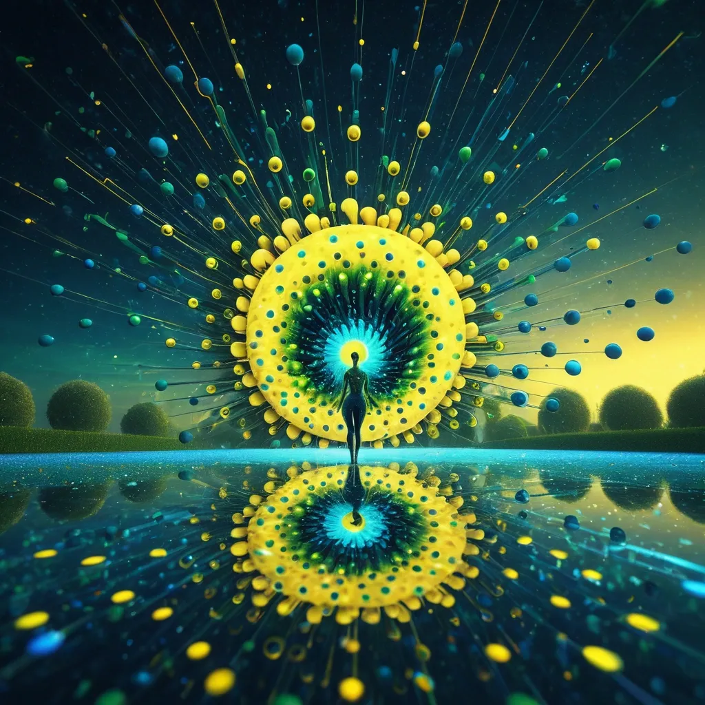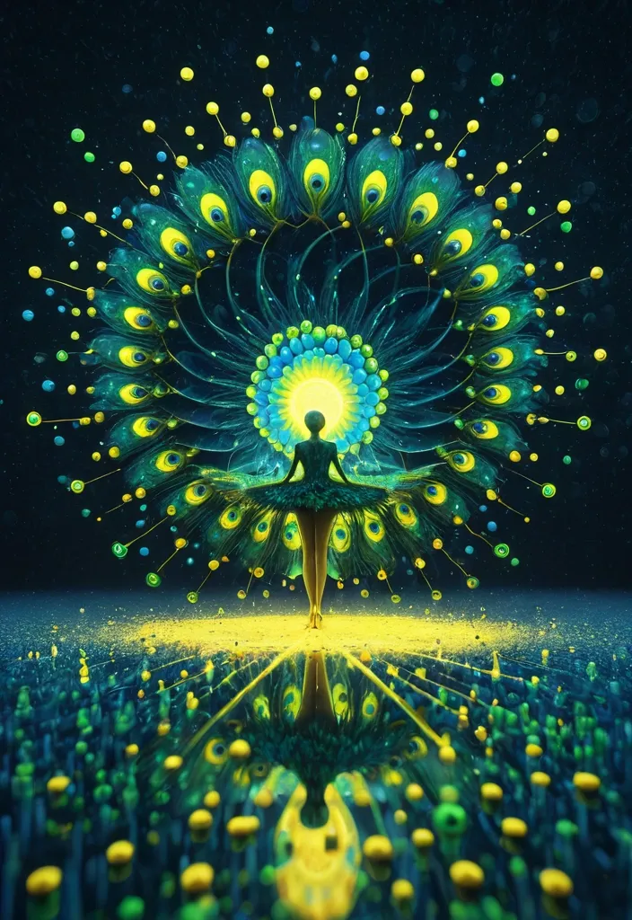 Creative peacock's feathers resembling a sun-like in vortex , (3D rendering:1.1) Horizontal surreal composed of (blue , green and yellow particles fading into the dark sky:1.1) , with a smaller flow , lighter (blue and green particle formation behind it diminishing in size:1.0) , a dancer rendered in (dim-yellow dots reflecting on calm , reflective ground:1.2) , extending from the base of the structures into the foreground. (Surrealism:1.2) , digital art , (high detail:1.1) , (intricate textures:1.0) , photo-realistic , octane render , vivid colors , smooth reflections , award-winning art , concept art. auditorium background. ,