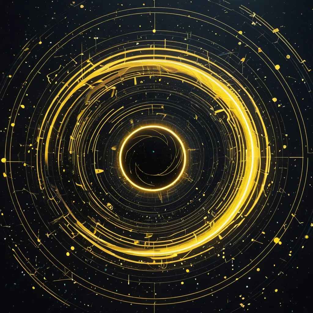 A retro Grok icon (featuring a black hole) depicted in an abstract graphic Interference style. The holographic elements should create a sense of movement with tiny yellow spacecraft fly on way. Employ a black color palette of sapphire black. Style: ethereal , abstract , digital art Lighting: Dramatic backlighting , dim glowing particles , contrasting dark background Composition: dynamic diagonal , composition , upward gaze Details: Sparkling white waves and smoke , streaking white light trails , sense of movement and wonder , magical atmosphere Quality: High detail , 4K , Masterpiece , Rendered in Octane. ,