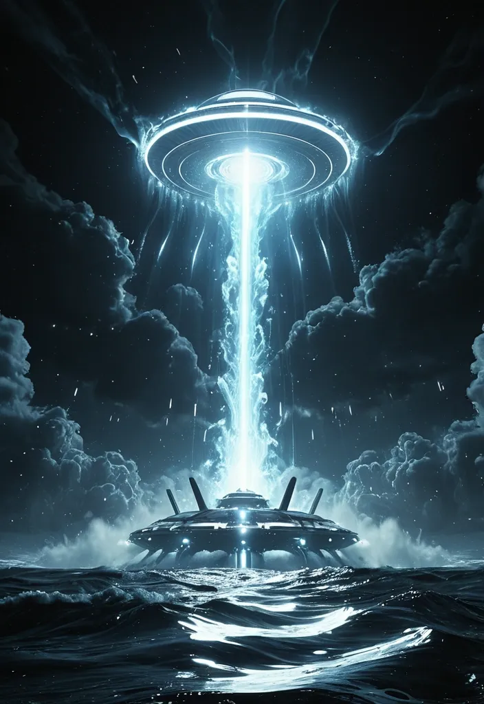 A colossal and wide sci-fi machine designed to transform ufo into water hovers above the ocean shrouded in smoke. Massive cylindrical exhausts underneath release torrents of water into the ocean rising black steam and vapor. Style: Celestial , ethereal , abstract , digital art black Lighting: Dramatic backlighting , bright glowing particles , contrasting dark background Composition: dynamic diagonal , composition , upward gaze Details: Sparkling white waves and smoke , streaking white light trails , sense of movement and wonder , magical atmosphere Quality: High detail , 4K , Masterpiece , Rendered in Octane. ,
