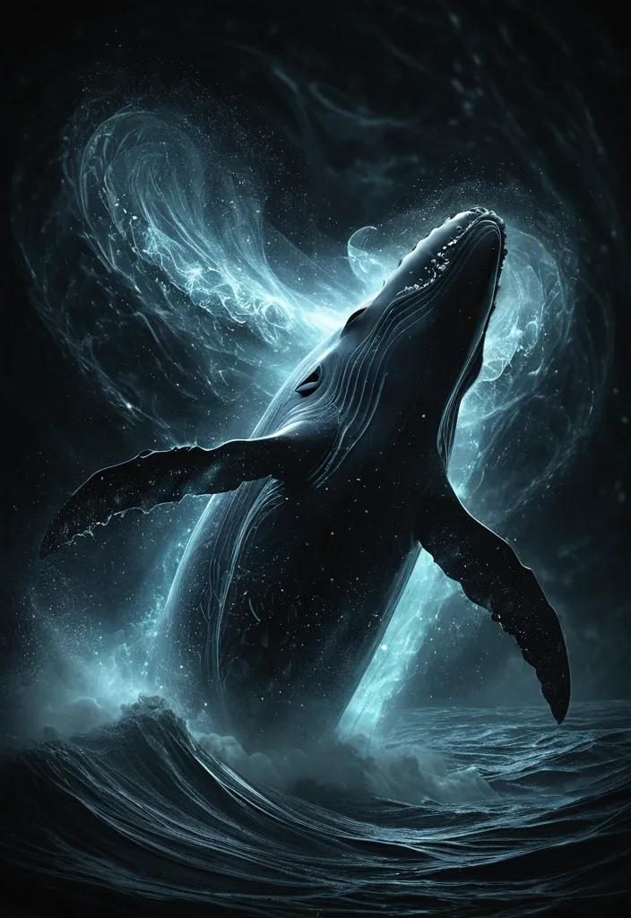 A persistence and resonance. stabilizing beyond containment , half Humpback Whale action with open mouth , transform over the ocean shrouded in swirling vortex mist. Style: Celestial , ethereal , abstract , digital art black vortex Lighting: Dramatic backlighting , dim glowing particles , contrasting dark background ,