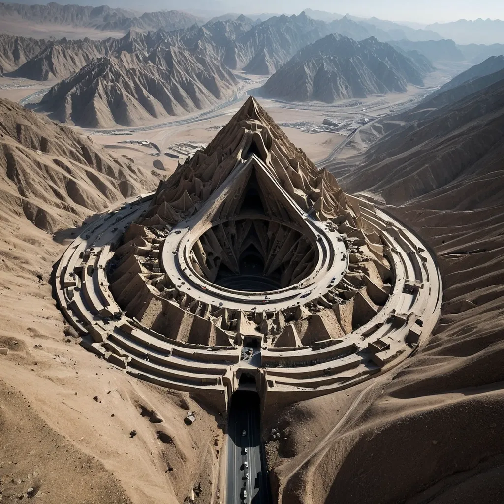 Bird's eye view , view from top , a inverted kingdom of caves shaped like a pyramid. A chaotic caves with twisted geometric forms - caves bending into impossible mountains rises from the Tora Bora mountains , Afghanistan , a Toyota Tacoma stand on roads looping like möbius strips , and bridges connecting disjointed structures that floating on middle of mountain , its apex balanced in the earth , its base pointing towards the starry evening sky , a mystical , ancient wonder born from the sands of time. ,