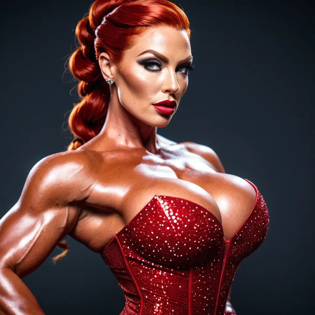 Generate Gorgeous female boss , bimbo , hourglass body , abnormally massive female bodybuilder , gorgeous , close up , full lips , big booty , redheaded , freckles on face and breast , braided design hair , feminine silhouette , too big breast , big booty , sexy thighs abs , silhouette , up close , flexing biceps , beautiful green eyes , legs are iconic and defining physical feature , both visually and in terms of combat ability.wearing an outfit that is a striking blend of elegance , power , and femininity , designed to command attention in any room. The suit is tailored to perfection , hugging the wearer’s curves with precision while emphasizing a structured silhouette. The fabric itself is a refined grey tweed patterned with subtle white grid lines , giving the suit a texture that feels both sophisticated and modern. The blazer features broad blue lapels and gold button accents , adding a luxurious touch that elevates the look beyond typical business attire. The matching high-waisted trousers elongate the frame , further enhancing the poised and commanding effect of the ensemble.The styling choices amplify the boldness of the suit. The inner blouse is a silky , greybutton-down shirt that complements the tweed’s tone while introducing a softer , feminine balance to the sharp tailoring of the jacket. The blouse peeks out neatly from under the blazer , maintaining elegance without drawing focus away from the suit’s commanding cut. Accessories are kept minimal yet intentional: a delicate layered gold necklace and hoop earrings that add glimmers of light and luxury without overpowering the outfit. The choice of voluminous , honey-brown braids cascading down her shoulders frames the face with both confidence and glamour , completing the commanding visual.Altogether , this look communicates a blend of authority and allure. It is business-ready yet fashion-forward , balancing corporate structure with vibrant femininity. The color palette blue , grey and gold avoids being overly delicate , instead embracing the richness of texture , structure , and presence. This is the kind of ensemble that speaks to ambition , sophistication , and personal style—ideal for someone who thrives in positions of influence but insists on expressing her individuality with bold elegance. It’s not just clothing—it’s a statement of power wrapped in grace. In luxury living legs that could crush a watermelon , skirt high boots are a bold and striking statement piece , crafted in glossy black patent leather that gives them a sleek , polished finish. Rising to just below the knee , the boots feature three adjustable buckle straps along the shaft , adding both edge and detail to their design. The towering stiletto heel , paired with a thick platform sole , creates an ultra-dramatic silhouette that elongates the leg and exudes power and confidence. With their combination of shine , height , and structure , these boots perfectly balance fierce femininity with high-fashion allure. Massive breast , massive cleavage , Up close shot She’s striking a dramatic , over-the-shoulder pose with one arm extended forward and her hips pushed back , creating a confident , theatrical silhouette as she looks toward the viewer. She’s wearing a sparkling red strapless dress with a high-cut design , paired with long purple gloves , giving the outfit a glamorous , classic showgirl vib ,