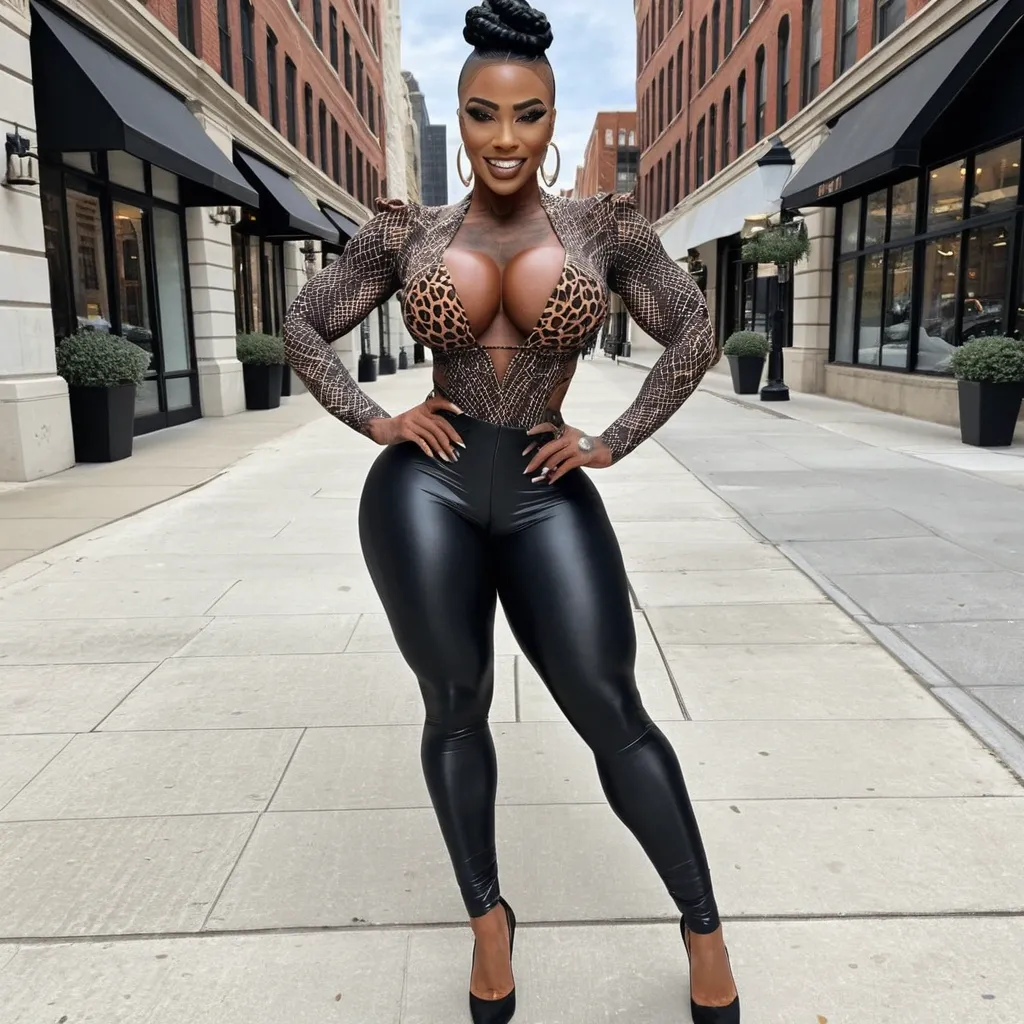 Generate a dark-skinned African-American woman , gorgeous female boss , bimbo , hourglass body , abnormally massive female bodybuilder , gorgeous , close up , full lips , big booty , black hair , braided-style-mohawk that she wears bald on the side , feminine silhouette , too big breast , big booty , sexy thighs abs , silhouette , up close , flexing biceps , beautiful light hazel eyes , legs are iconic and defining physical feature , both visually and in terms of combat ability.wearing an outfit that is a striking blend of elegance , power , and femininity , designed to command attention in any room. outfit in this image is a modern , giving it both structure and a touch of relaxed style. highlighting her curves while keeping the look balanced and versatile. Its neutral tone contrasts nicely against the blue denim , keeping the ensemble cohesive without overpowering the statement of the.Completing the polished and fashionable. Together , the outfit blends everyday comfort with bold , confident styling. This is the kind of ensemble that speaks to ambition , sophistication , and personal style—ideal for someone who thrives in positions of influence but insists on expressing her individuality with bold elegance. It’s not just clothing—it’s a statement of power wrapped in grace , Massive cleavage thunder thighs , enormous butt , muscular legs , hazel eyes , Her outfit gives off classy , soft , feminine elegance with that old-school traditionally ladylike vibe — but modernized just enough to feel fresh. The cream button-up modest crop top is polished and refined with those gold emblem buttons — that’s a subtle high-value touch without screaming for attention. The sheer/light fabric looks airy and comfortable for daylight wear , and the pearl necklace and earrings lock that timeless feminine grace into place. She looks like she understands that simple well coordinated usually beats loud and chaotic any day.Her tan high-waist trousers balance her top perfectly. They’re modest , smooth , tailored enough to keep things classy , and the matching gold button ties the whole look together so it doesn’t feel like two random pieces. She looks feminine and fashionable without abandoning tradition — like the kind of woman grandma would nod at and say “yes… that’s how a lady dresses for daytime public.” It respects the past while still letting her express her youth and confidence.This is the type of outfit you could wear walking downtown shops , brunch , meeting family , or even a quiet afternoon date. There is softness , poise , refinement , and a little playful confidence in her smile. It’s modest but flattering , and it’s intentional. She looks like she takes pride in presenting herself well — not to impress everyone — but because she values dignity , grace , and showing up in the world looking put together. Modest top modest top ,