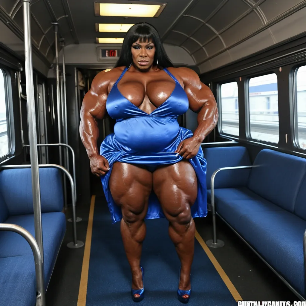 À african giant muscular chubby femalebodybuilder , housewife black woman BBW musclée , heavy weight bodybuildeuse géante et plantureuse with giant chest , imposante dame massive , beautiful make up , Angela Basset face , in a train , avec de gros seins , énormes biceps musclés , in blue satin short mini nightgown with heels , exposant les seins , bras musclés exposés , dominante , jambes massives exposées , agressive , ,