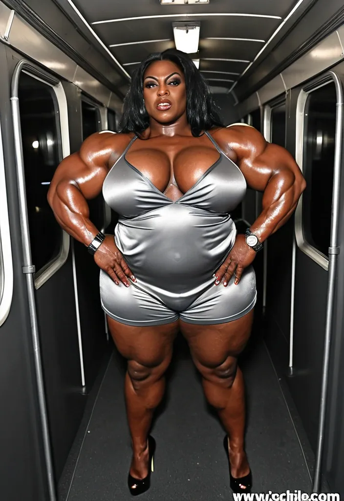 À african giant muscular chubby femalebodybuilder , housewife black woman BBW musclée , heavy weight bodybuildeuse géante et plantureuse with giant chest , imposante dame massive , beautiful make up , Beyoncé face , in a train , avec de gros seins , énormes biceps musclés , in gris satin short mini nightgown with heels , exposant les seins , bras musclés exposés , dominante , jambes massives exposées , agressive , ,