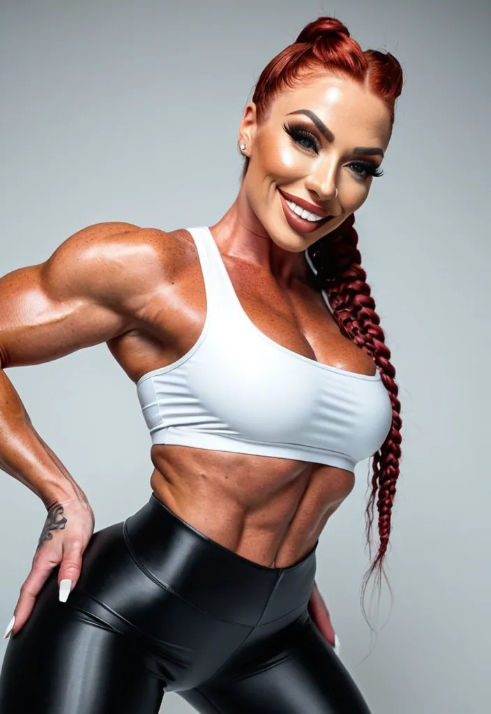 Generate Gorgeous female boss , bimbo , hourglass body , abnormally massive female bodybuilder , gorgeous , close up , full lips , big booty , redheaded , freckles on face and breast , braided design hair , feminine silhouette , too big breast , big booty , sexy thighs abs , silhouette , up close , flexing biceps , beautiful green eyes , legs are iconic and defining physical feature , both visually and in terms of combat ability.wearing an outfit that is a striking blend of elegance , power , and femininity , designed to command attention in any room. The suit is tailored to perfection , hugging the wearer’s curves with precision while emphasizing a structured silhouette. The fabric itself is a refined grey tweed patterned with subtle white grid lines , giving the suit a texture that feels both sophisticated and modern. The blazer features broad blue lapels and gold button accents , adding a luxurious touch that elevates the look beyond typical business attire. The matching high-waisted trousers elongate the frame , further enhancing the poised and commanding effect of the ensemble.The styling choices amplify the boldness of the suit. The inner blouse is a silky , greybutton-down shirt that complements the tweed’s tone while introducing a softer , feminine balance to the sharp tailoring of the jacket. The blouse peeks out neatly from under the blazer , maintaining elegance without drawing focus away from the suit’s commanding cut. Accessories are kept minimal yet intentional: a delicate layered gold necklace and hoop earrings that add glimmers of light and luxury without overpowering the outfit. The choice of voluminous , honey-brown braids cascading down her shoulders frames the face with both confidence and glamour , completing the commanding visual.Altogether , this look communicates a blend of authority and allure. It is business-ready yet fashion-forward , balancing corporate structure with vibrant femininity. The color palette blue , grey and gold avoids being overly delicate , instead embracing the richness of texture , structure , and presence. This is the kind of ensemble that speaks to ambition , sophistication , and personal style—ideal for someone who thrives in positions of influence but insists on expressing her individuality with bold elegance. It’s not just clothing—it’s a statement of power wrapped in grace. In luxury living legs that could crush a watermelon , skirt high boots are a bold and striking statement piece , crafted in glossy black patent leather that gives them a sleek , polished finish. Rising to just below the knee , the boots feature three adjustable buckle straps along the shaft , adding both edge and detail to their design. The towering stiletto heel , paired with a thick platform sole , creates an ultra-dramatic silhouette that elongates the leg and exudes power and confidence. With their combination of shine , height , and structure , these boots perfectly balance fierce femininity with high-fashion allure. She’s leaning forward in a playful , confident pose with her torso twisted toward the viewer , shoulders angled and head tilted back slightly as she smiles. She’s wearing a white cropped top under a black , form-fitting jacket with glossy black high-waisted pants that accentuate her athletic build and exposed , defined abs. The camera is positioned low and close , angled upward in a dramatic low-angle shot that exaggerates depth and makes her figure feel larger-than-life and dominant. ,