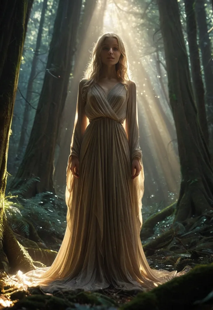 A breathtaking low wide-angle , hyperrealistic 8K ultra-high-definition cinematic photograph of an impossibly beautiful Dutch woman standing amidst a mystical , ancient forest reminiscent of 'The Lord of the Rings'. A single , brilliant shaft of golden light pierces through the dense , enchanted canopy , illuminating her with a divine , ethereal glow , creating dramatic shadows and highlights. Her face possesses a captivating blend of pristine innocence and profound delicate beauty , reflecting her pure and gentle essence. She has striking , crystal-clear blue eyes that hold an alluring mystery within their depth. Her features are distinctly Dutch , with fair , luminous skin that appears almost translucent in the soft forest light. Her long , flowing hair (e.g. , golden blonde or soft brown) cascades elegantly , catching the light and seeming to shimmer with an otherworldly quality. She is gracefully poised , clad in a subtle , ethereal garment (perhaps a soft , light-colored dress made of flowing fabric) that drapes beautifully and modestly over her form , highlighting her elegant silhouette. She exudes a deeply captivating and mysterious aura , her posture one of serene contemplation or gentle movement , perfectly integrated within the magical environment. The forest itself is vibrant and alive with luminous flora , ancient , gnarled trees , and a delicate , shimmering mist rising from the forest floor , all rendered with incredible detail and depth , enhancing the profound fantasy atmosphere. The low wide-angle shot emphasizes her majestic and enchanting presence against the grandeur of the forest , drawing the viewer's gaze from the lush foreground to her captivating figure. ,