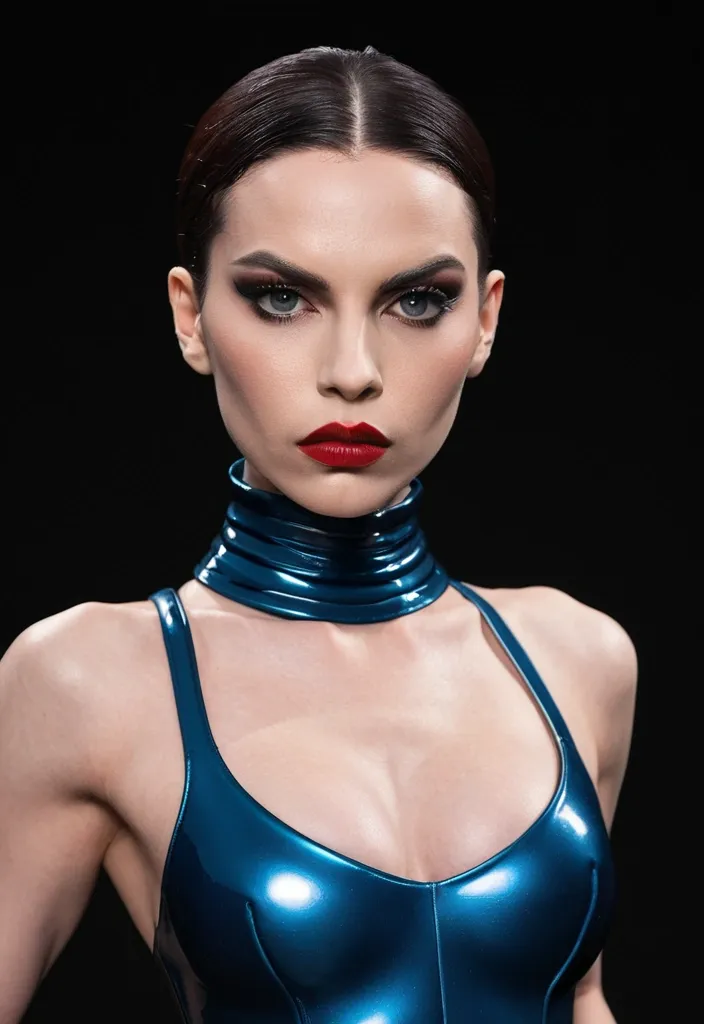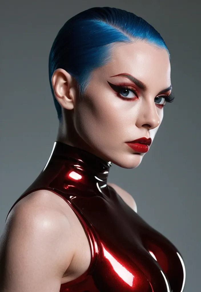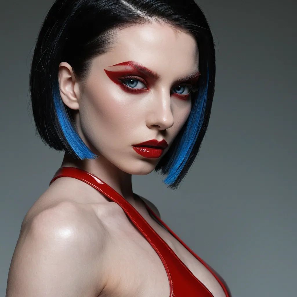 Ruby Fierce possesses a face sculpted with breathtaking precision—sharp , elegant , and intensely expressive. Her jawline is refined and symmetrical , giving her profile a statuesque quality , while her cheekbones sit high and defined , casting natural shadows that enhance the dramatic structure of her face. Her skin is flawlessly smooth with a porcelain-like glow , adding a refined softness that contrasts beautifully with her fierce expression. Her lips are full and perfectly shaped , painted in a bold , rich red that intensifies her presence and enhances the natural symmetry of her features. Her eyes are mesmerizing—icy blue and razor-focused , framed by expertly sculpted brows that arc with authority. The sharp winged eyeliner elongates and lifts her gaze , giving her a piercing , cat-like intensity that commands attention. Her stare is unwavering and fearless , carrying both intelligence and danger in a single glance. She has the kind of beauty that feels cinematic—every feature deliberate , every angle photogenic , as if she were carved for the spotlight. Her hair is sleek and impeccably styled , cut into a short , chin-length bob that emphasizes her strong facial geometry. The dark , glossy color contrasts sharply with her pale skin , intensifying the striking clarity of her eyes and the boldness of her lips. The cut is modern , clean , and powerful—no excess , no softness beyond what she chooses. The style frames her face like armor , giving her a polished and commanding silhouette even before she speaks or moves. Her physique is toned , balanced , and undeniably feminine with a controlled strength beneath every curve. Her shoulders are smooth yet slightly defined , leading into shapely arms that hint at quiet athleticism rather than bulk. She has a narrow , sculpted waist that flows into a subtly hourglass shape , creating perfect proportion and symmetry. Her posture is flawless—spine straight , head high—projecting confidence without effort and making her appear taller and more imposing than she already is. ,