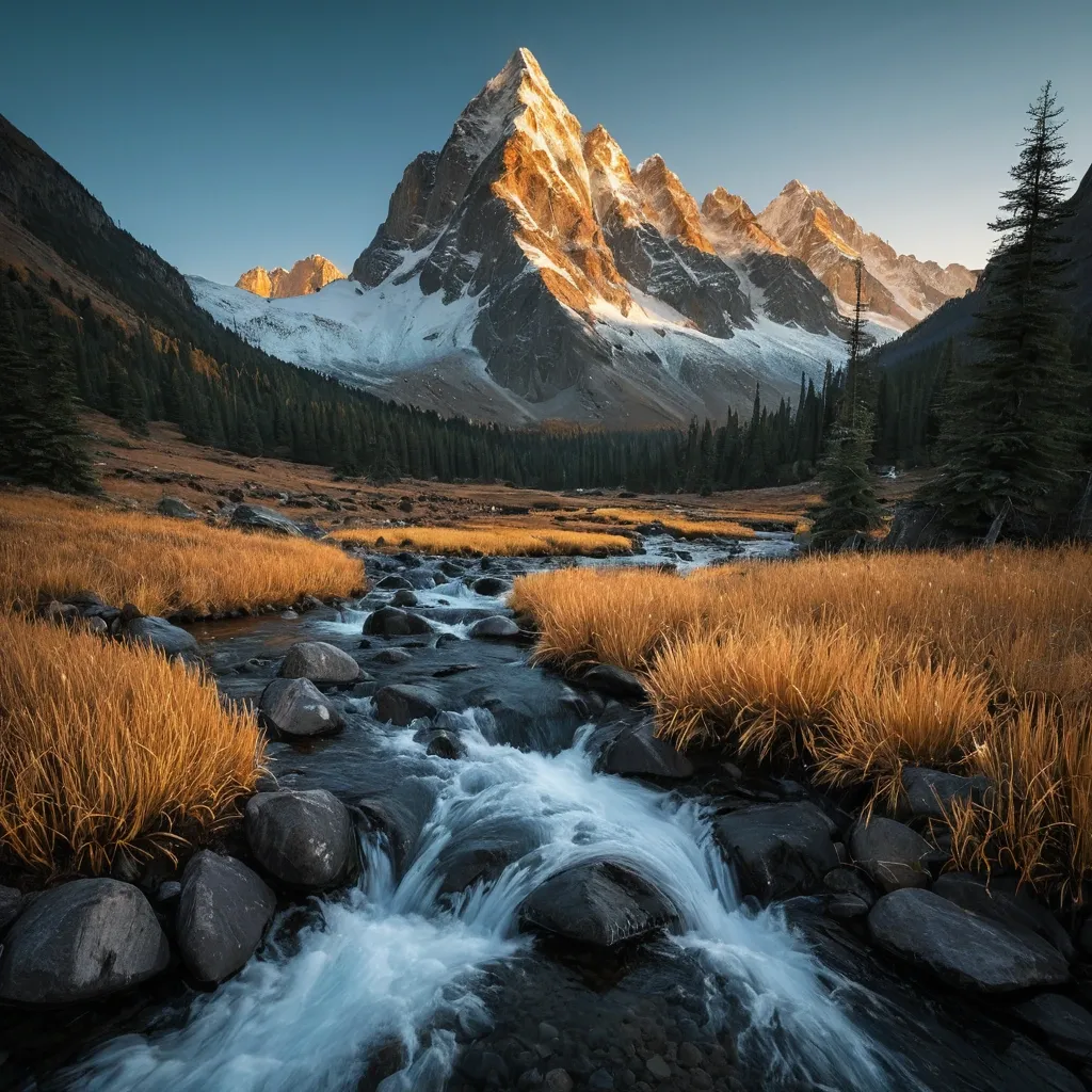 A breathtaking mountain landscape at dawn , featuring a dramatic view of jagged snow-capped peaks illuminated by the first rays of sunlight. The foreground includes a clear stream cascading over smooth rocks , creating soft , flowing lines that lead the eye deeper into the scene. The rocky terrain is punctuated by patches of golden grasses , showcasing the vibrant autumn colors , while dark green pine trees add depth to the composition. The sky is a soft gradient of warm oranges and cool blues , reflecting a serene yet exhilarating atmosphere. The interplay of light and shadow accentuates the textures of the mountains and water , enhancing the overall depth of the image. Use a wide-angle perspective to capture the grandeur of the landscape , ensuring that the composition invites the viewer to explore every detail within the rugged beauty of nature. The style is reminiscent of epic landscape photography , focusing on realism with a touch of artistic flair. The mood is tranquil yet awe-inspiring , evoking a sense of adventure and connection with the natural world. ,