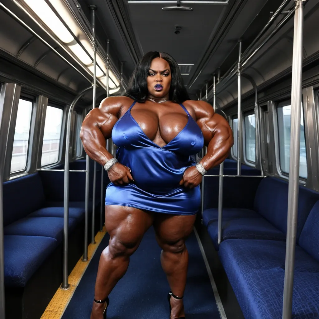 À african giant muscular chubby femalebodybuilder , housewife black woman BBW musclée , heavy weight bodybuildeuse géante et plantureuse with giant chest , imposante dame massive , beautiful make up Rihanna face , in a train , avec de gros seins , énormes biceps musclés , in blue marine satin short mini nightgown with heels , exposant les seins , bras musclés exposés , dominante , jambes massives exposées , agressive , ,
