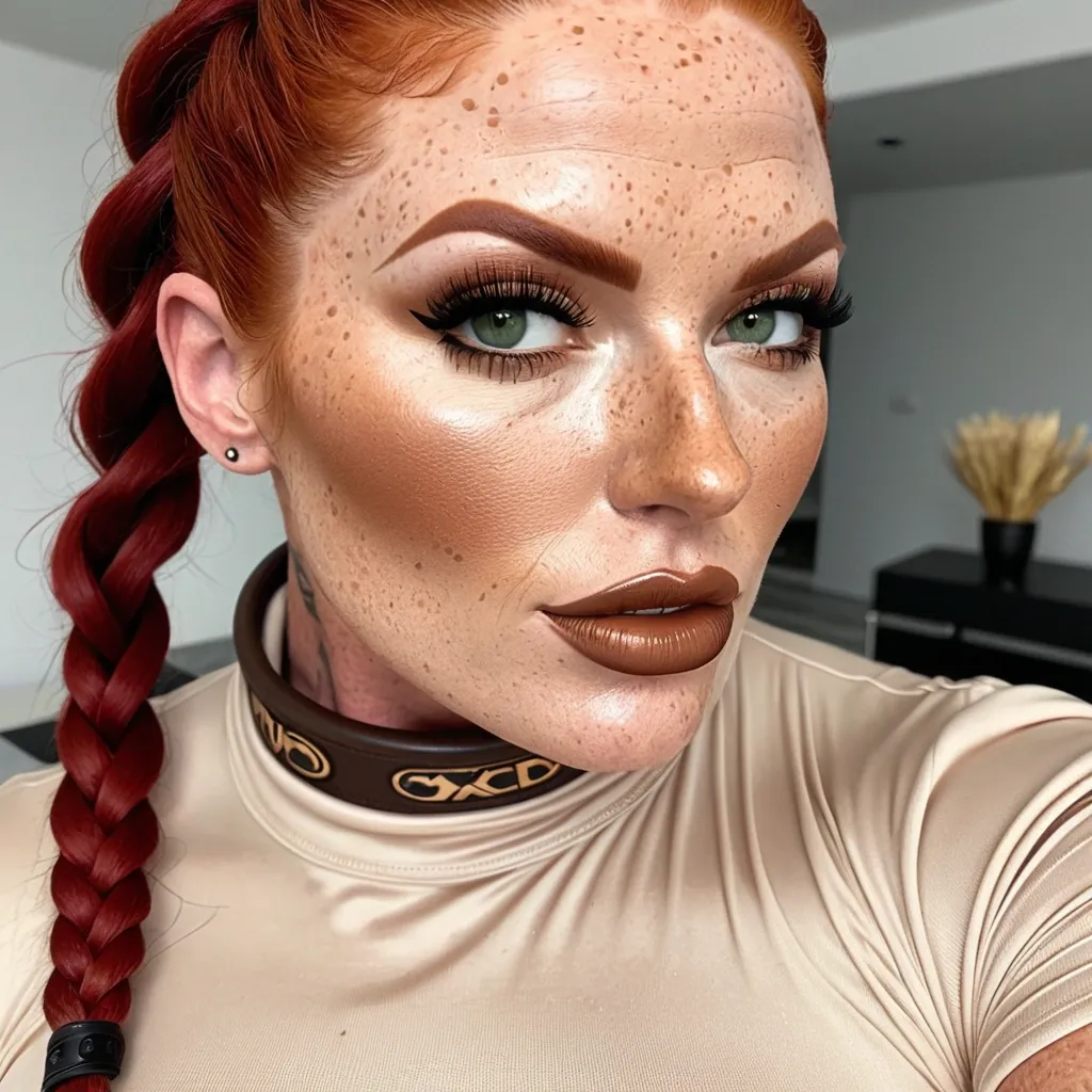 Generate Gorgeous female boss , bimbo , hourglass body , abnormally massive female bodybuilder , gorgeous , close up , full lips , big booty , redheaded , freckles on face and breast , braided design hair , feminine silhouette , too big breast , big booty , sexy thighs abs , silhouette , up close , flexing biceps , beautiful green eyes , legs are iconic and defining physical feature , both visually and in terms of combat ability.wearing an outfit that is a striking blend of elegance , power , and femininity , designed to command attention in any room. The suit is tailored to perfection , hugging the wearer’s curves with precision while emphasizing a structured silhouette. The fabric itself is a refined grey tweed patterned with subtle white grid lines , giving the suit a texture that feels both sophisticated and modern. The blazer features broad blue lapels and gold button accents , adding a luxurious touch that elevates the look beyond typical business attire. The matching high-waisted trousers elongate the frame , further enhancing the poised and commanding effect of the ensemble.The styling choices amplify the boldness of the suit. The inner blouse is a silky , greybutton-down shirt that complements the tweed’s tone while introducing a softer , feminine balance to the sharp tailoring of the jacket. The blouse peeks out neatly from under the blazer , maintaining elegance without drawing focus away from the suit’s commanding cut. Accessories are kept minimal yet intentional: a delicate layered gold necklace and hoop earrings that add glimmers of light and luxury without overpowering the outfit. The choice of voluminous , honey-brown braids cascading down her shoulders frames the face with both confidence and glamour , completing the commanding visual.Altogether , this look communicates a blend of authority and allure. It is business-ready yet fashion-forward , balancing corporate structure with vibrant femininity. The color palette blue , grey and gold avoids being overly delicate , instead embracing the richness of texture , structure , and presence. This is the kind of ensemble that speaks to ambition , sophistication , and personal style—ideal for someone who thrives in positions of influence but insists on expressing her individuality with bold elegance. It’s not just clothing—it’s a statement of power wrapped in grace. In luxury living legs that could crush a watermelon , skirt high boots are a bold and striking statement piece , crafted in glossy black patent leather that gives them a sleek , polished finish. Rising to just below the knee , the boots feature three adjustable buckle straps along the shaft , adding both edge and detail to their design. The towering stiletto heel , paired with a thick platform sole , creates an ultra-dramatic silhouette that elongates the leg and exudes power and confidence. With their combination of shine , height , and structure , these boots perfectly balance fierce femininity with high-fashion allure. wearing a tight , swede beige pajama-style top with a t-shirt and dark brown rubber piping along the collar and single visible button , the fabric clinging to every curve and reflecting soft highlights. Gorgeous green eyes , freckles ,