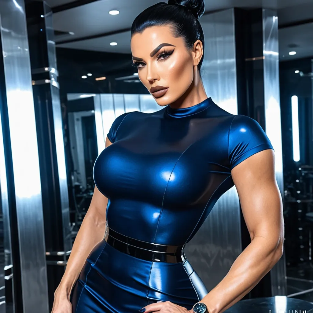 24 years old , Generate Gorgeous female boss , bimbo , hourglass body , abnormally massive female bodybuilder , gorgeous , close up , full lips , big boot , hair in bun , black hair , short hair 1940s/futuristic feminine silhouette , too big breast , big booty , sexy thighs abs , silhouette , up close , flexing biceps , gorgeous brown eyes , legs are iconic and defining physical feature , both visually and in terms of combat ability.wearing an outfit that is a striking blend of elegance , power , and femininity , designed to command attention in any room. The suit is tailored to perfection , hugging the wearer’s curves with precision while emphasizing a structured silhouette. The fabric itself is a refined grey tweed patterned with subtle white grid lines , giving the suit a texture that feels both sophisticated and modern. The blazer features broad blue lapels and gold button accents , adding a luxurious touch that elevates the look beyond typical business attire. The matching high-waisted trousers elongate the frame , further enhancing the poised and commanding effect of the ensemble.The styling choices amplify the boldness of the suit. The inner blouse is a silky , greybutton-down shirt that complements the tweed’s tone while introducing a softer , feminine balance to the sharp tailoring of the jacket. The blouse peeks out neatly from under the blazer , maintaining elegance without drawing focus away from the suit’s commanding cut. Accessories are kept minimal yet intentional: a delicate layered gold necklace and hoop earrings that add glimmers of light and luxury without overpowering the outfit. The choice of voluminous , honey-brown braids cascading down her shoulders frames the face with both confidence and glamour , completing the commanding visual.Altogether , this look communicates a blend of authority and allure. It is business-ready yet fashion-forward , balancing corporate structure with vibrant femininity. The color palette blue , grey and gold avoids being overly delicate , instead embracing the richness of texture , structure , and presence. This is the kind of ensemble that speaks to ambition , sophistication , and personal style—ideal for someone who thrives in positions of influence but insists on expressing her individuality with bold elegance. It’s not just clothing—it’s a statement of power wrapped in grace. In luxury living legs that could crush a watermelon , skirt high boots are a bold and striking statement piece , crafted in glossy black patent leather that gives them a sleek , polished finish. Rising to just below the knee , the boots feature three adjustable buckle straps along the shaft , adding both edge and detail to their design. The towering stiletto heel , paired with a thick platform sole , creates an ultra-dramatic silhouette that elongates the leg and exudes power and confidence. With their combination of shine , height , and structure , these boots perfectly balance fierce femininity with high-fashion allure. High cheekbones , prominent jawline , gorgeous big light reflecting brown eyes , black and dark navy blue futuristic dressy t-shirt , and long blue skirt ,