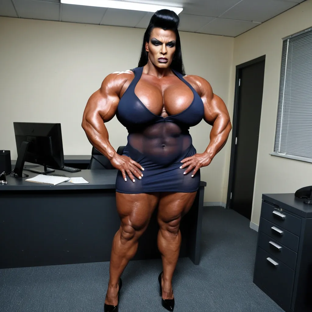 À giant muscular chubby most busty femalebodybuilder , housewife woman BBW musclée , heavy weight bodybuildeuse géante et plantureuse with giant chest , imposante dame massive , beautiful make up Mo'nique face , in a police station office , avec de gros seins , énormes biceps musclés , in black marine transparent very short sleeveless mini night room dress with heels , exposant les seins , bras musclés exposés , dominante , jambes massives exposées , agressive , ,