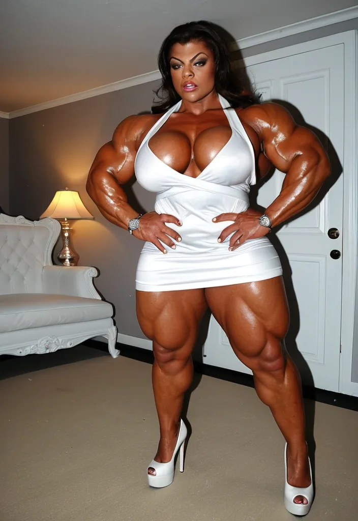 À giant muscular chubby most busty femalebodybuilder , housewife woman BBW musclée , heavy weight bodybuildeuse géante et plantureuse with giant chest , imposante dame massive , beautiful make up Taraji Henson face , in a ring match , avec de gros seins , énormes biceps musclés , in white laces satin very short sleeveless mini night room dress with heels , exposant les seins , bras musclés exposés , dominante , jambes massives exposées , agressive , ,