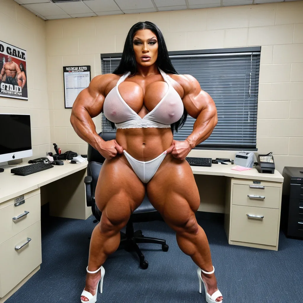À giant muscular chubby most busty femalebodybuilder , housewife woman BBW musclée , heavy weight bodybuildeuse géante et plantureuse with giant chest , imposante dame massive , beautiful make up Megan thee stallion face , in a police station office , avec de gros seins , énormes biceps musclés , in white laces transparent very short mini loose nightgown with heels , exposant les seins , bras musclés exposés , dominante , jambes massives exposées , agressive , ,