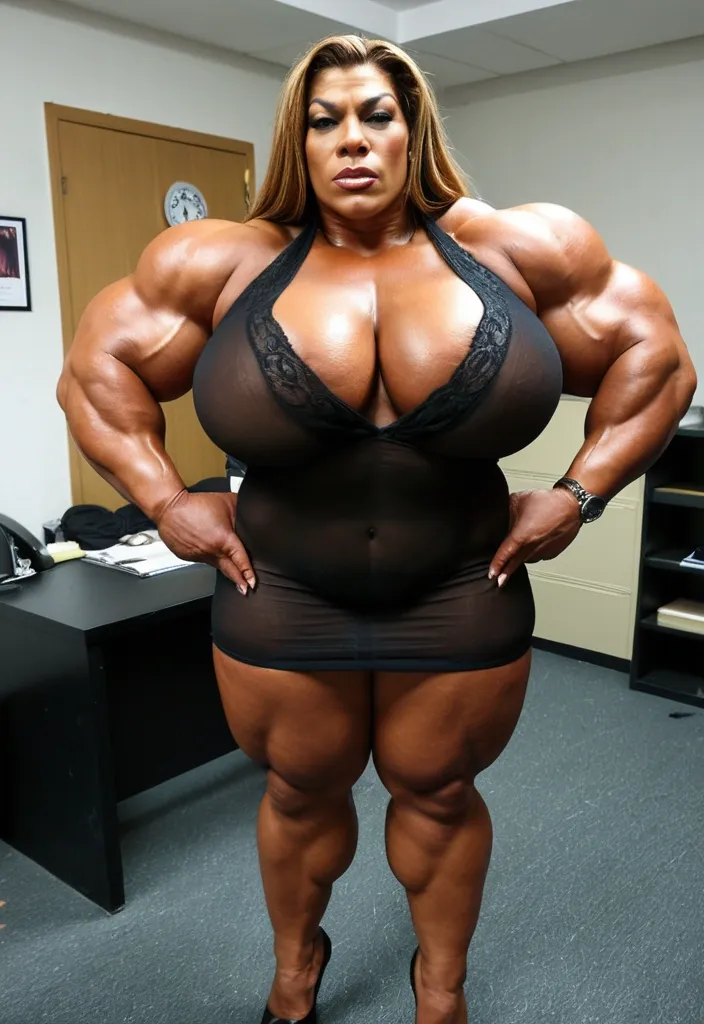 À giant muscular chubby most busty femalebodybuilder , housewife woman BBW musclée , heavy weight bodybuildeuse géante et plantureuse with giant chest , imposante dame massive , beautiful make up Mo'nique face , in a police station office , avec de gros seins , énormes biceps musclés , in black laces transparent very short mini loose room night dress with heels , exposant les seins , bras musclés exposés , dominante , jambes massives exposées , agressive , ,