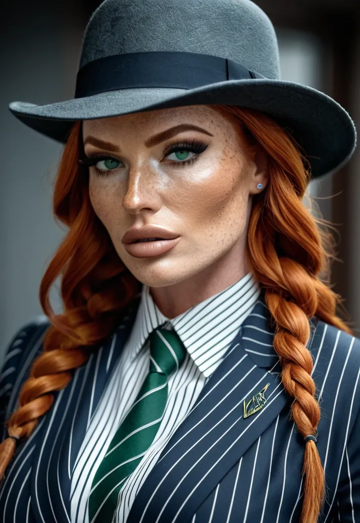 Generate Gorgeous female boss , bimbo , hourglass body , abnormally massive female bodybuilder , gorgeous , close up , full lips , big booty , redheaded , freckles on face and breast , braided design hair , feminine silhouette , too big breast , big booty , sexy thighs abs , silhouette , up close , flexing biceps , beautiful green eyes , legs are iconic and defining physical feature , both visually and in terms of combat ability.wearing an outfit that is a striking blend of elegance , power , and femininity , designed to command attention in any room. The suit is tailored to perfection , hugging the wearer’s curves with precision while emphasizing a structured silhouette. The fabric itself is a refined grey tweed patterned with subtle white grid lines , giving the suit a texture that feels both sophisticated and modern. The blazer features broad blue lapels and gold button accents , adding a luxurious touch that elevates the look beyond typical business attire. The matching high-waisted trousers elongate the frame , further enhancing the poised and commanding effect of the ensemble.The styling choices amplify the boldness of the suit. The inner blouse is a silky , greybutton-down shirt that complements the tweed’s tone while introducing a softer , feminine balance to the sharp tailoring of the jacket. The blouse peeks out neatly from under the blazer , maintaining elegance without drawing focus away from the suit’s commanding cut. Accessories are kept minimal yet intentional: a delicate layered gold necklace and hoop earrings that add glimmers of light and luxury without overpowering the outfit. The choice of voluminous , honey-brown braids cascading down her shoulders frames the face with both confidence and glamour , completing the commanding visual.Altogether , this look communicates a blend of authority and allure. It is business-ready yet fashion-forward , balancing corporate structure with vibrant femininity. The color palette blue , grey and gold avoids being overly delicate , instead embracing the richness of texture , structure , and presence. This is the kind of ensemble that speaks to ambition , sophistication , and personal style—ideal for someone who thrives in positions of influence but insists on expressing her individuality with bold elegance. It’s not just clothing—it’s a statement of power wrapped in grace. In luxury living legs that could crush a watermelon , skirt high boots are a bold and striking statement piece , crafted in glossy black patent leather that gives them a sleek , polished finish. Rising to just below the knee , the boots feature three adjustable buckle straps along the shaft , adding both edge and detail to their design. The towering stiletto heel , paired with a thick platform sole , creates an ultra-dramatic silhouette that elongates the leg and exudes power and confidence. With their combination of shine , height , and structure , these boots perfectly balance fierce femininity with high-fashion allure. , gorgeous green eyes. Freckles charcoal and navy blue fedora hat , striped two piece suit , black tie shite oxford button up t-shirt , ,