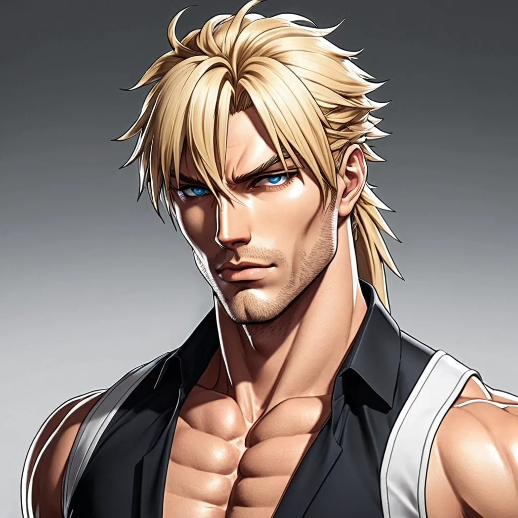 Me gustaria crear un chico que tenga una cara definida anime en el cual sea rubio y tenga una cara como buena onda y un fisico cuidado y llamativo pero no tanto , sobre su pelo me gustaria que lo tuviera atado como una cola de caballo pero se dejase algunos en la frente como un flequillo pero no tan exageradamente y que tenga una vestimenta moderna ,