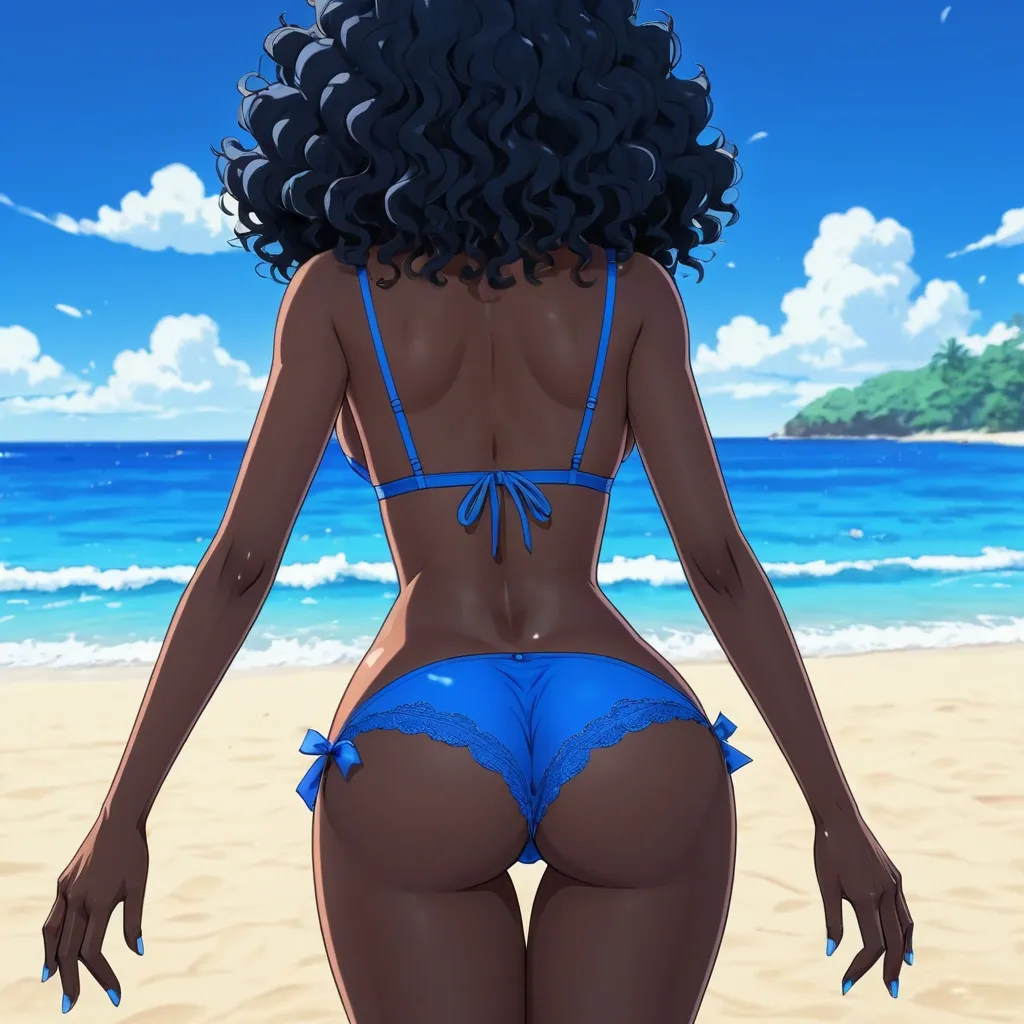 Anime , beach , rear view , blackskin , cute girl , black curly hair , blue bra , blue panties , cartoon , hand under big butt , , Cartoon ,