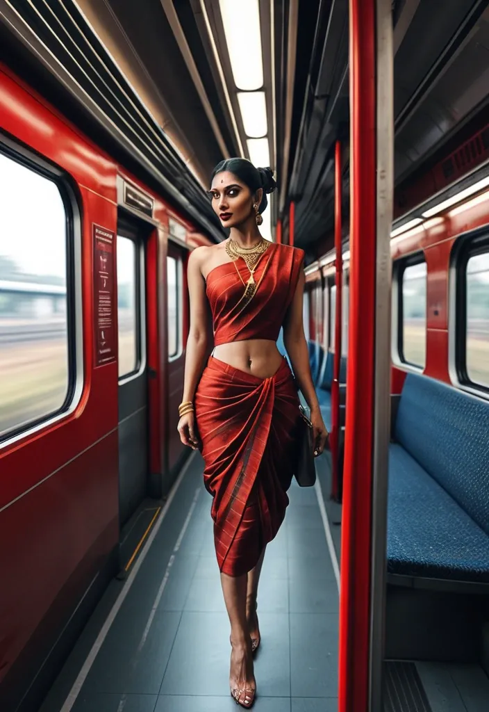 Hyper photo-realistic candid lifestyle fashion photo inside a modern commuter train carriage. A young white woman (early 20s) , slim/curvy build , light-medium warm skin tone , sitting alone across a blue patterned fabric bench seat. Pose: relaxed “godfather” posture with both arms stretched wide along the backrest , legs crossed (right leg over left) , torso turned slightly left , head turned left looking out the window. Accessories: oversized cream over-ear headphones , small oval black sunglasses , gold hoop earrings , thin gold necklace , small shoulder bag with brown monogram pattern tucked under her arm , wearing maharashtrian style traditional Saree. Hair: dark brown , high ponytail with loose face-framing strands. Setting: train interior with red door frame on right edge , ventilation grille above window , blue mosaic seat fabric , dark floor. Window shows fast motion blur of passing train in red tones. Lighting: soft daylight from window , natural skin texture , iPhone video-frame look. Composition: full body head-to-toe centered , subject fills ~70% of frame height , vertical 9:16 aspect , eye-level camera from across the aisle , 24–28mm wide lens look , sharp focus on subject with background slightly softer , photorealistic real human. Negative prompt: cartoon , CGI , airbrushed skin , extra limbs , bad hands , cropped feet , cropped head , text misspelled , blurry subject , watermark , oversaturated HDR ,