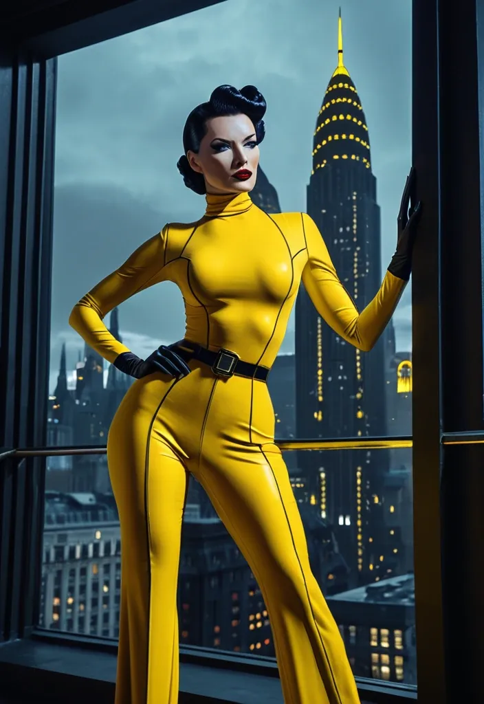 This woman embodies a striking fusion of 1940s noir elegance and futuristic sophistication , evoking the poised confidence of a classic femme fatale while inhabiting a sleek , high-tech world. This woman embodies a striking fusion of 1940s noir elegance and futuristic sophistication , evoking the poised confidence of a classic femme fatale while inhabiting a sleek , high-tech world. Her posture is commanding yet graceful , with one hand resting on her hip and the other gripping a pistol behind her back , suggesting both authority and latent danger. The setting—a towering , neon-lit cityscape visible through a massive window—blends retro-futuristic aesthetics , with sharp spires piercing a moody sky , reminiscent of 1940s cinematic skylines but reimagined in a cyberpunk vein. Her attire , a form-fitting , taupe-colored dress with intricate paneling and a high collar , mirrors the structured tailoring of mid-20th-century fashion while incorporating modern , almost architectural lines that hint at advanced design. The matching beret , tilted jauntily , adds a touch of vintage charm , grounding her in the 1940s aesthetic while the overall silhouette feels timelessly powerful.Her face is a study in sharp beauty and intensity , with high cheekbones and a sculpted jawline that convey strength and determination. Her eyes , dark and piercing , are framed by bold , arched brows and dramatic eyeliner , giving her a gaze that is both alluring and formidable , capable of commanding a room or unnerving an adversary. Her lips , painted a deep , classic red , are full and slightly parted , exuding sensuality and confidence , a hallmark of the 1940s silver-screen siren. Her hair is pulled back into a sleek , low bun , meticulously styled to maintain an air of polished perfection , with not a strand out of place. This hairstyle , combined with the beret , enhances her retro-futuristic allure , blending the disciplined elegance of the past with a forward-looking precision that feels almost engineered.Her body is a masterpiece of exaggerated , hourglass proportions , with a cinched waist , voluptuous hips , and a pronounced bust , all accentuated by the modest tailored dress that clings to her curves like a second skin. The dress’s design , with its geometric paneling and seamless fit , highlights her physique while maintaining an air of sophistication , avoiding overt vulgarity. Her stance—weight shifted to one leg , hip cocked—emphasizes her powerful lower body , with long , shapely legs that suggest both grace and strength. The futuristic blend is evident in the dress’s subtle sheen and the way it molds to her form , as if crafted with advanced materials. This woman is a paradox: a 1940s icon reborn in a dystopian future , her body and presence a bold statement of femininity , power , and unyielding control. Her posture is commanding yet graceful , with one hand resting on her hip and the other gripping a pistol behind her back , suggesting both authority and latent danger. The setting—a towering , neon-lit cityscape visible through a massive window—blends retro-futuristic aesthetics , with sharp spires piercing a moody sky , reminiscent of 1940s cinematic skylines but reimagined in a cyberpunk vein. Her attire , a form-fitting , taupe-colored dress with intricate paneling and a high collar , mirrors the structured tailoring of mid-20th-century fashion while incorporating modern , almost architectural lines that hint at advanced design. The matching beret , tilted jauntily , adds a touch of vintage charm , grounding her in the 1940s aesthetic while the overall silhouette feels timelessly powerful.Her face is a study in sharp beauty and intensity , with high cheekbones and a sculpted jawline that convey strength and determination. Her eyes , dark and piercing , are framed by bold , arched brows and dramatic eyeliner , giving her a gaze that is both alluring and formidable , capable of commanding a room or unnerving an adversary. Her lips , painted a deep , classic red , are full and slightly parted , exuding sensuality and confidence , a hallmark of the 1940s silver-screen siren. Her hair is pulled back into a sleek , low bun , meticulously styled to maintain an air of polished perfection , with not a strand out of place. This hairstyle , combined with the beret , enhances her retro-futuristic allure , blending the disciplined elegance of the past with a forward-looking precision that feels almost engineered.Her body is a masterpiece of exaggerated , hourglass proportions , with a cinched waist , voluptuous hips , and a pronounced bust , all accentuated by the tailored dress that clings to her curves like a second skin. The dress’s design , with its geometric paneling and seamless fit , highlights her physique while maintaining an air of sophistication , avoiding overt vulgarity. Her stance—weight shifted to one leg , hip cocked—emphasizes her powerful lower body , with long , shapely legs that suggest both grace and strength. The futuristic blend is evident in the dress’s subtle sheen and the way it molds to her form , as if crafted with advanced materials. This woman is a paradox: a 1940s icon reborn in a dystopian future , her body and presence a bold statement of femininity , power , and unyielding control , turtleneck top her outfit is mustard yellow and chrome ,