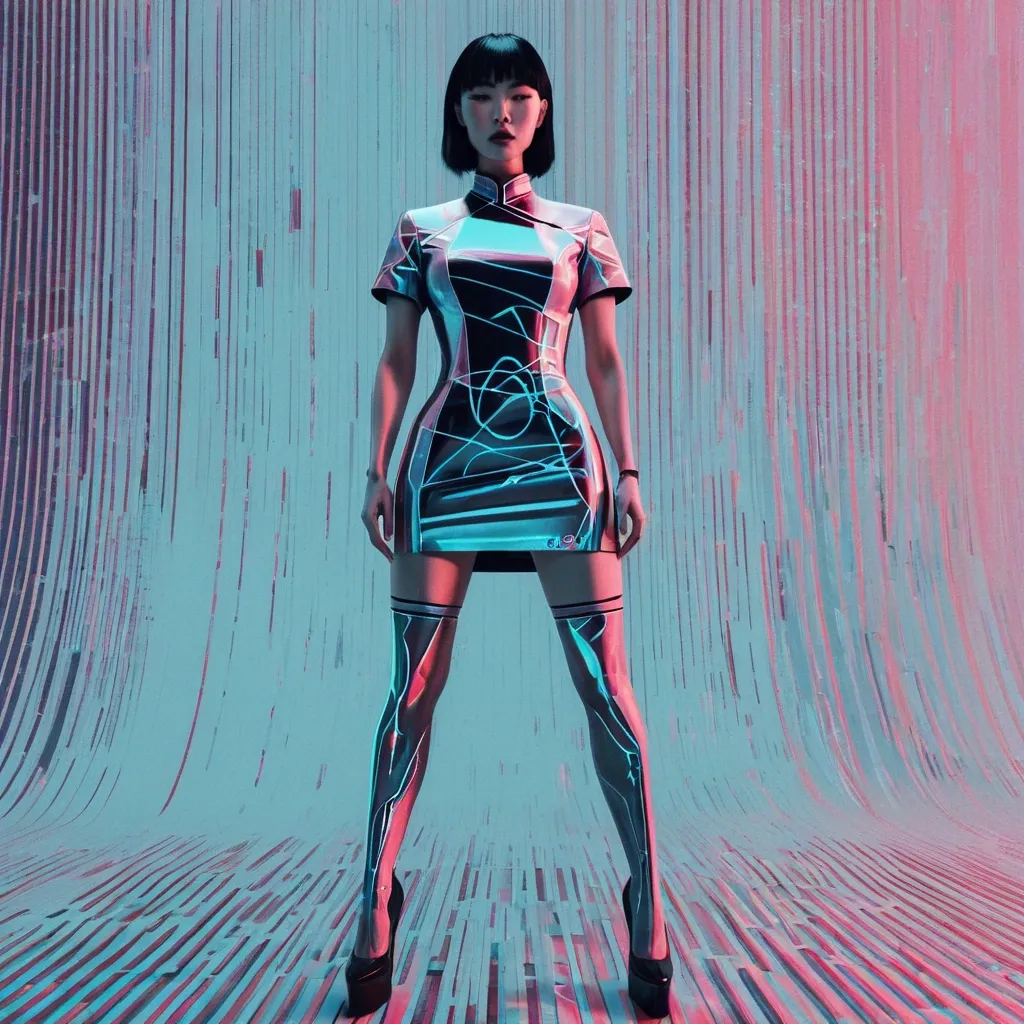 glitch portrait , minimalistic of cheongsam girl. modern cheongsam style , realistic proportions. pop designed Logo Marked "No Rules , Just Punk". dynamic angle perspective , extreme foreshortening , epic pose dramatic perspective. full body , clearly defined edges , clean minimal aesthetic , vertical digital distortion and fragmented interference patterns overlaying figure , pixelation , randomized vertical glitch artifacts , data corruption aesthetic , softly diffused ambient lighting , pastel hues accentuating glitches , high-definition digital noise texture --ar 9:16 --raw --stylize 300 ,